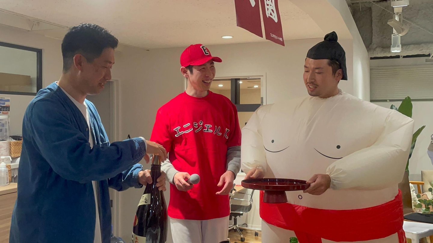 音楽が流れ、人事部長のアナウンスとともに、話題の大谷選手と力士に扮した先輩社員が登場しました!