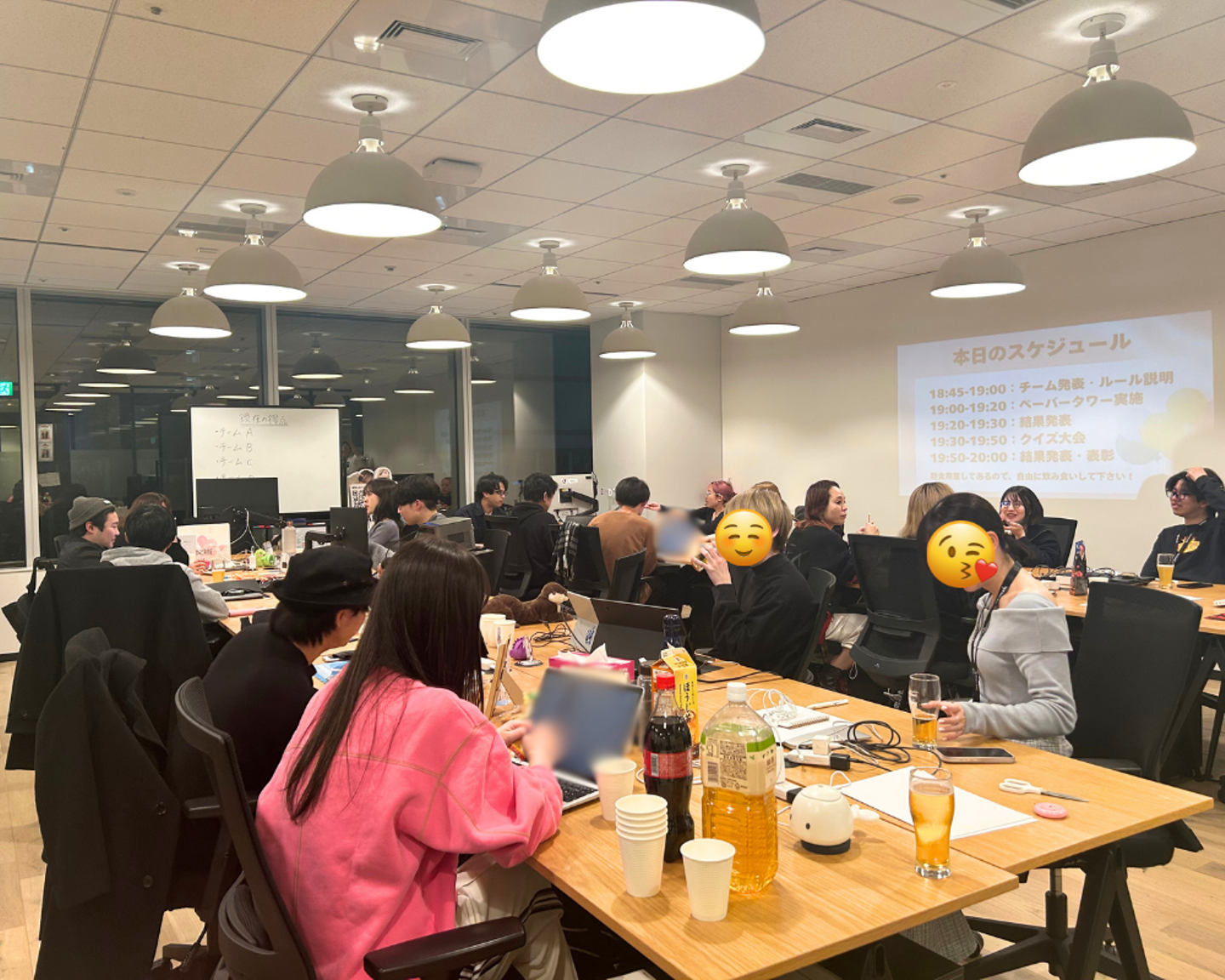 静かに話し合うチームもいれば、体を動かしながら情熱的に意見を出し合うチームがいたりと、、