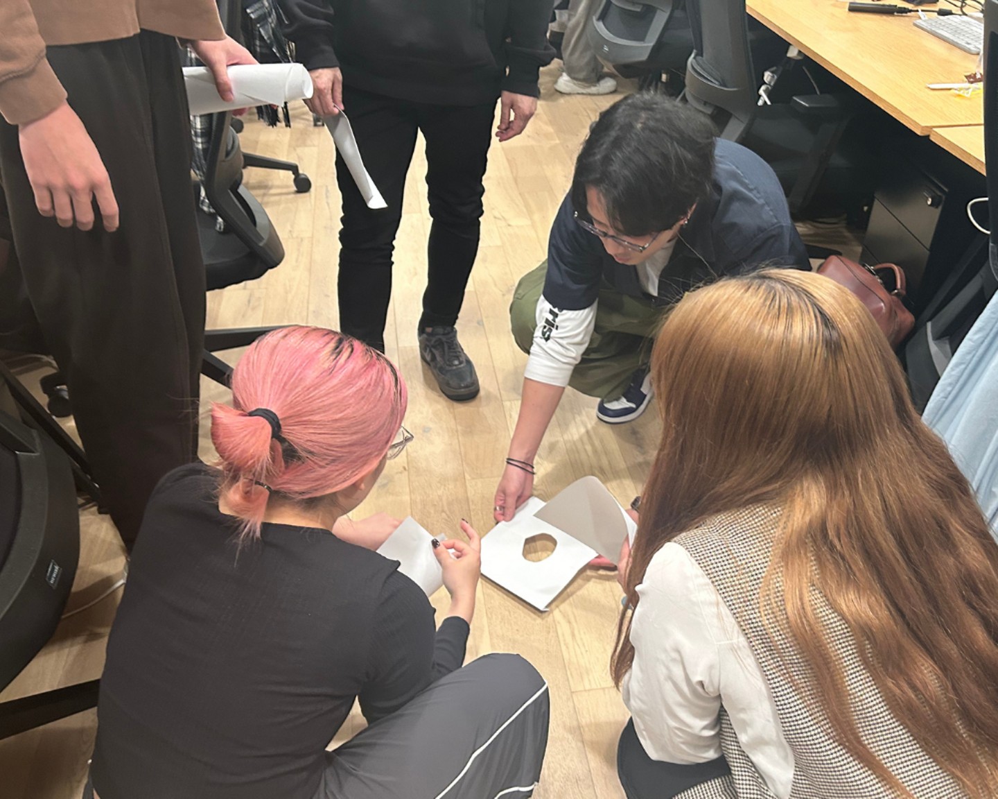 早速チーム発表を終え、1つ目の”ペーパータワー”に向けた作戦会議中の様子なのですが、、