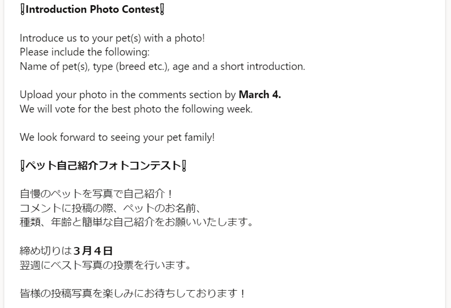 これは3月に実施されたフォトコンテストです。みんなでPET自慢や人気投票を実施をしました!