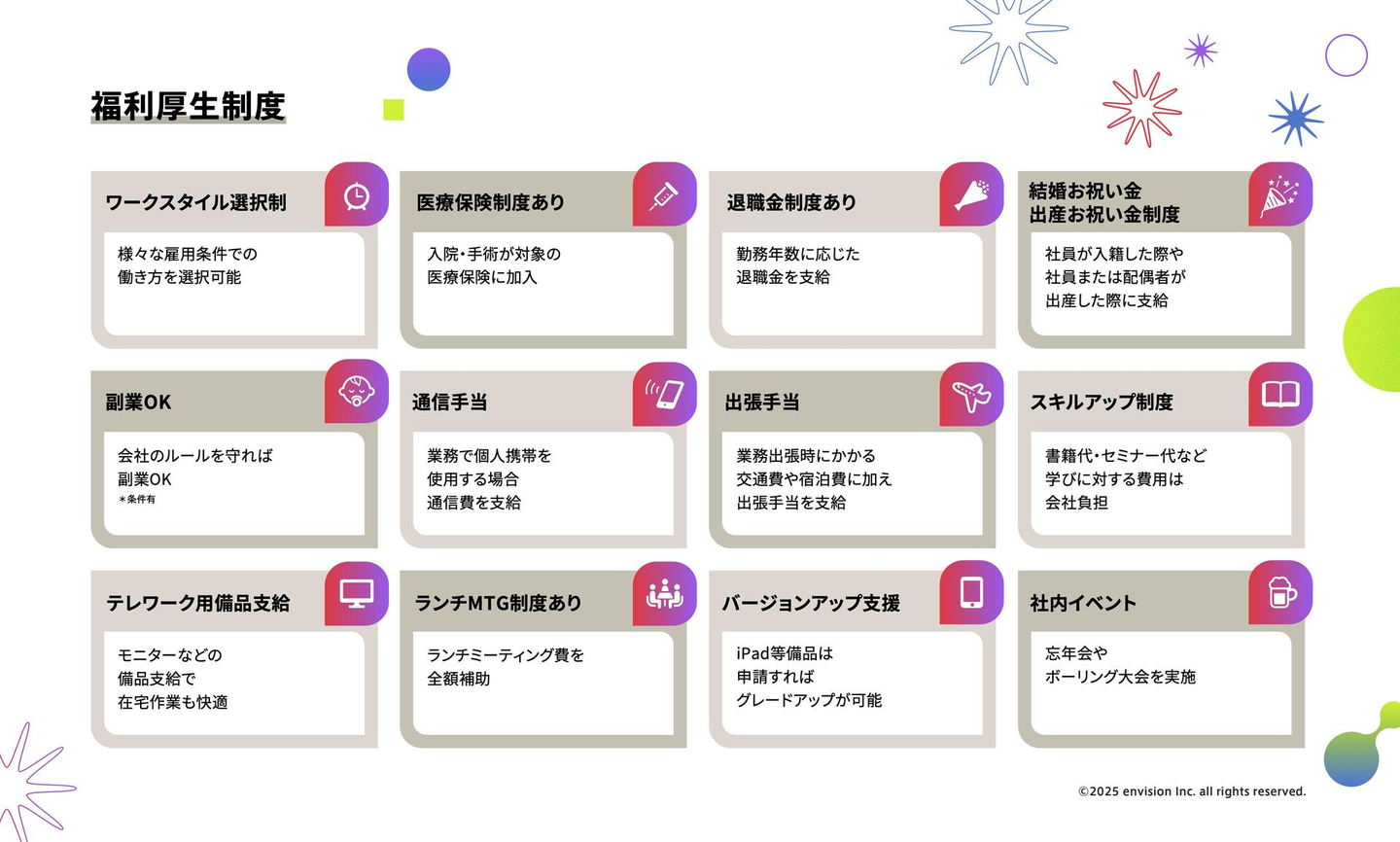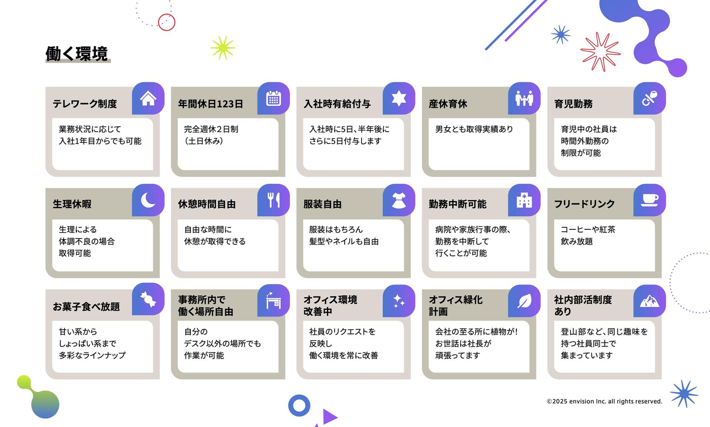 エンビジョンでは、パーパスに共感し、共に良い社会の実現に向けてチャレンジできる人材を求めています。「クリエイティブ」のチカラを信じられる方はもちろん、積極的に新規コミュニティーを広げていける方と共に働きたいと考えております。