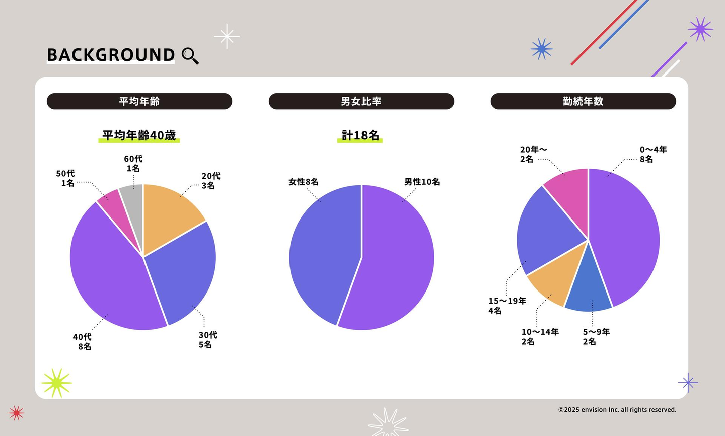 社歴、年齢、スキルセットが異なる多様なメンバーが在籍しており、約35%の方が芸術系学校以外の学校を卒業しています。