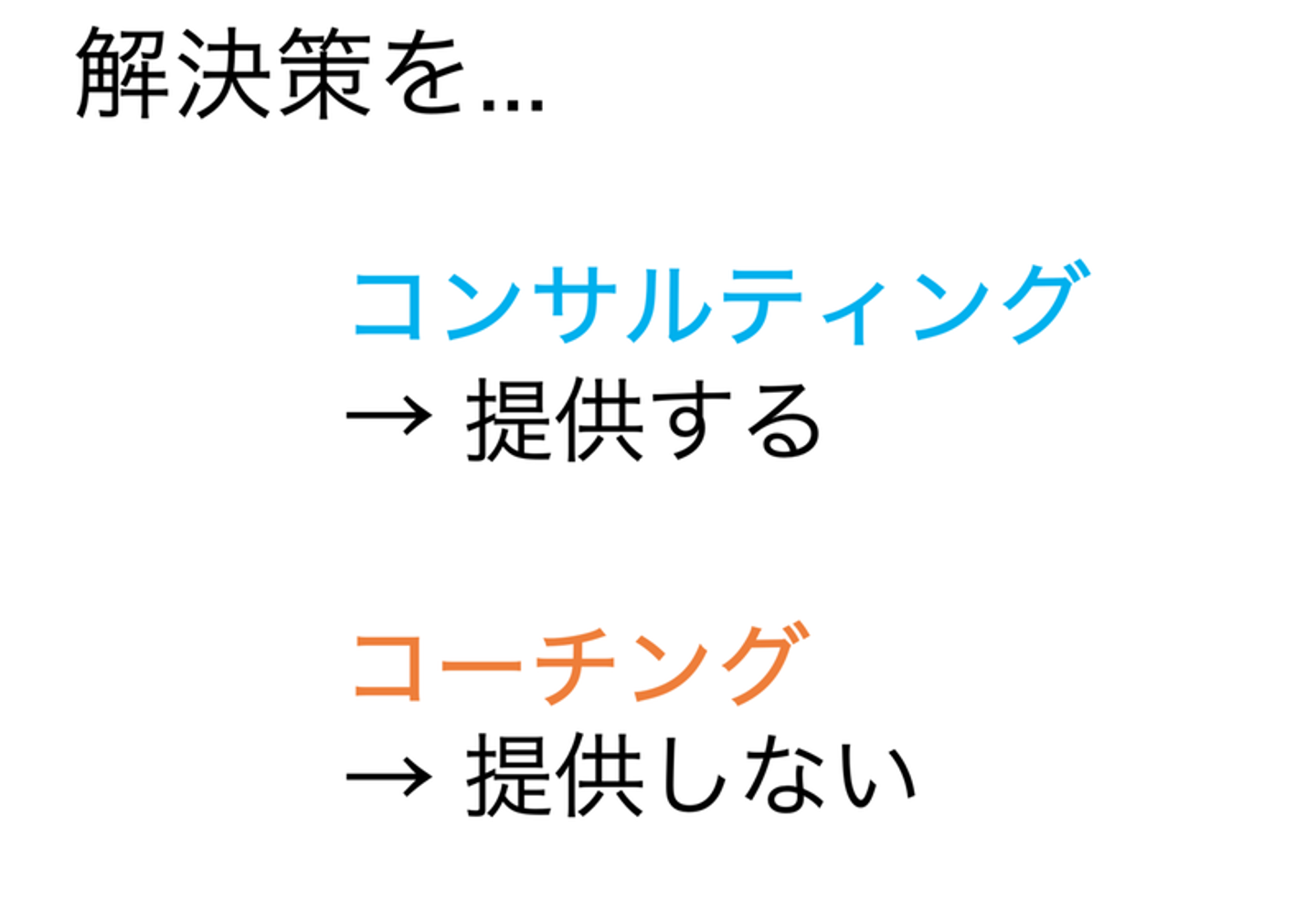 一方、コーチングでは”解決策はあなたの中にある”という前提の元、最も効果的な解決法をクライアント本人から引き出します。
