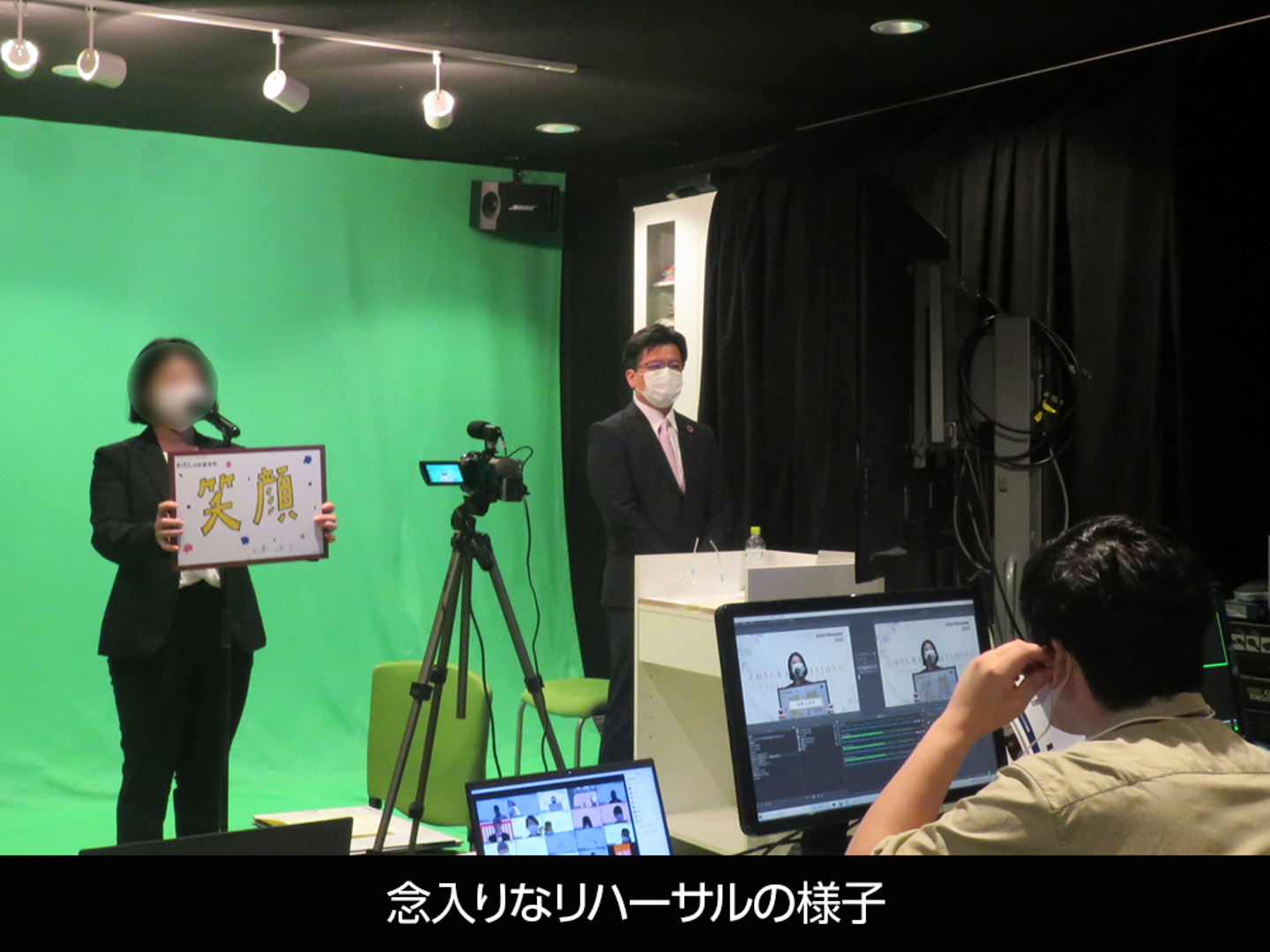 そのため今回は新入社員には出社してもらい、新卒社員、私、そして撮影スタッフという最小限の人数で撮影スタジオにて辞令、決意表明などを行いました。