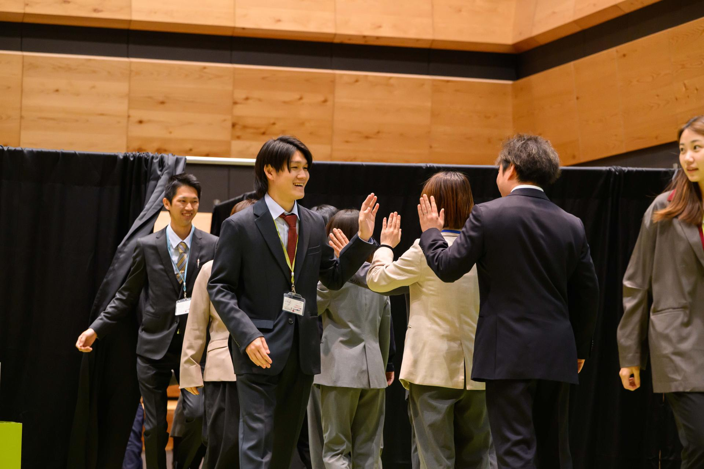 拠点ごとの発表のタイミングでは、入れ替わりにハイタッチをする場面もあり、