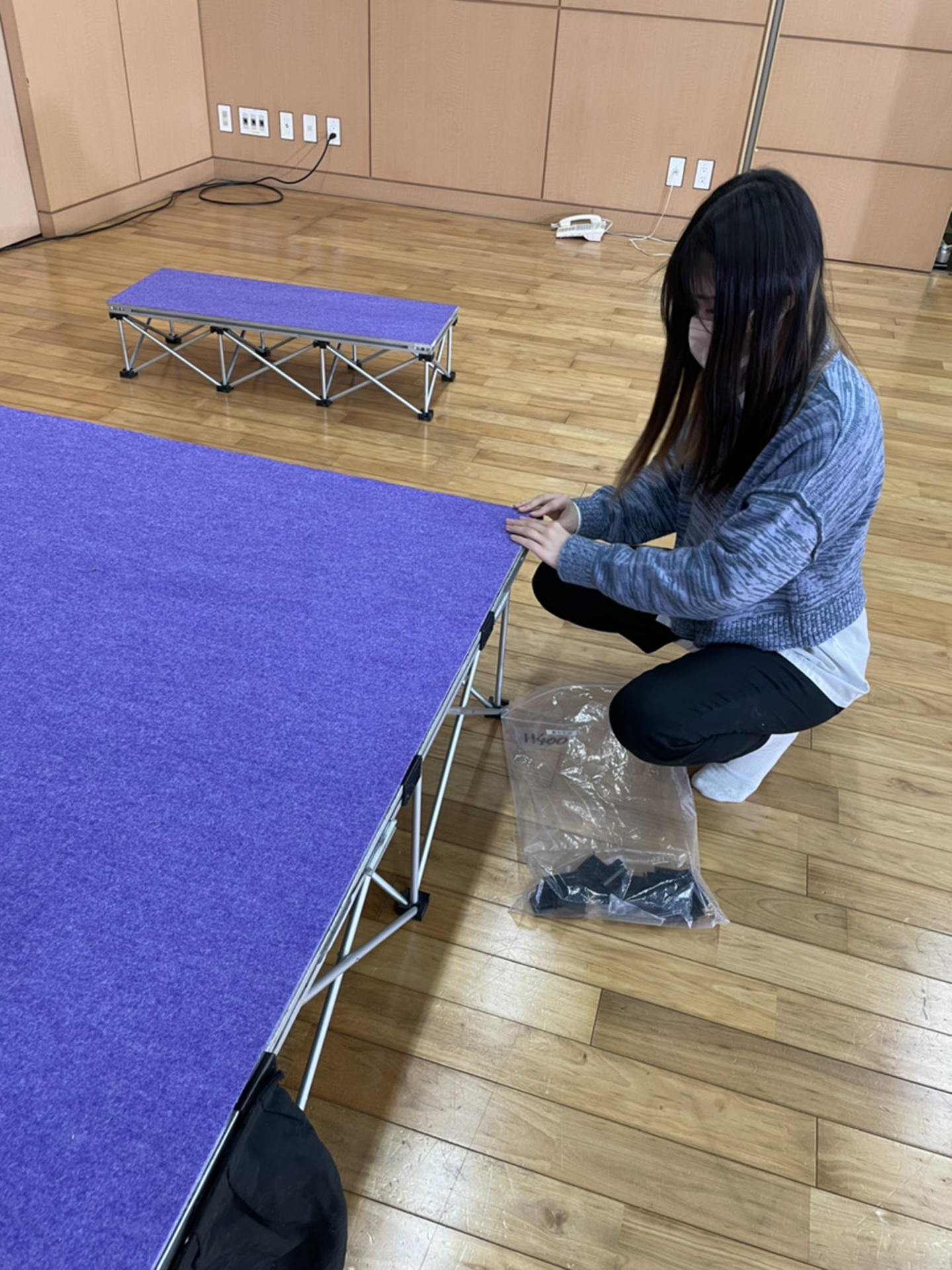 こちらは簡単ステージの現場に来ていただきました!パンチカーペット貼り作業なかなか難しかったけどきれいに仕上がりました!入社前から経験を増やしてかっこいいですね!