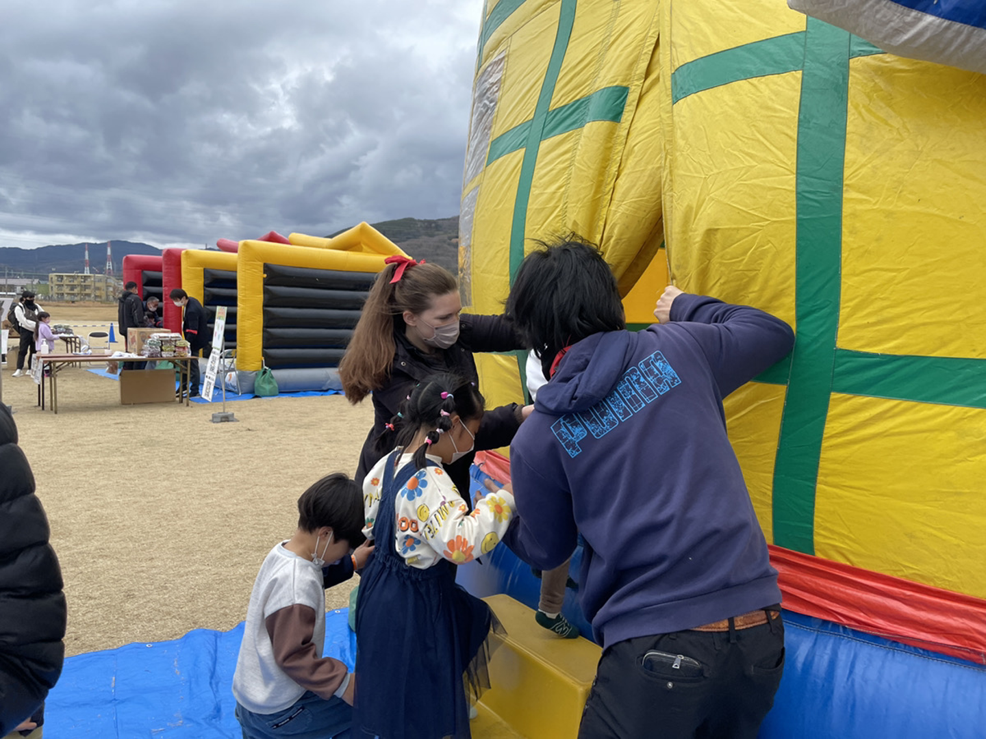 大きい遊具は空気で膨らんでいるので、出入りのときにはすごい風なのですが、子どもたちがスムーズに出入りできるようサポートをしてくれました!