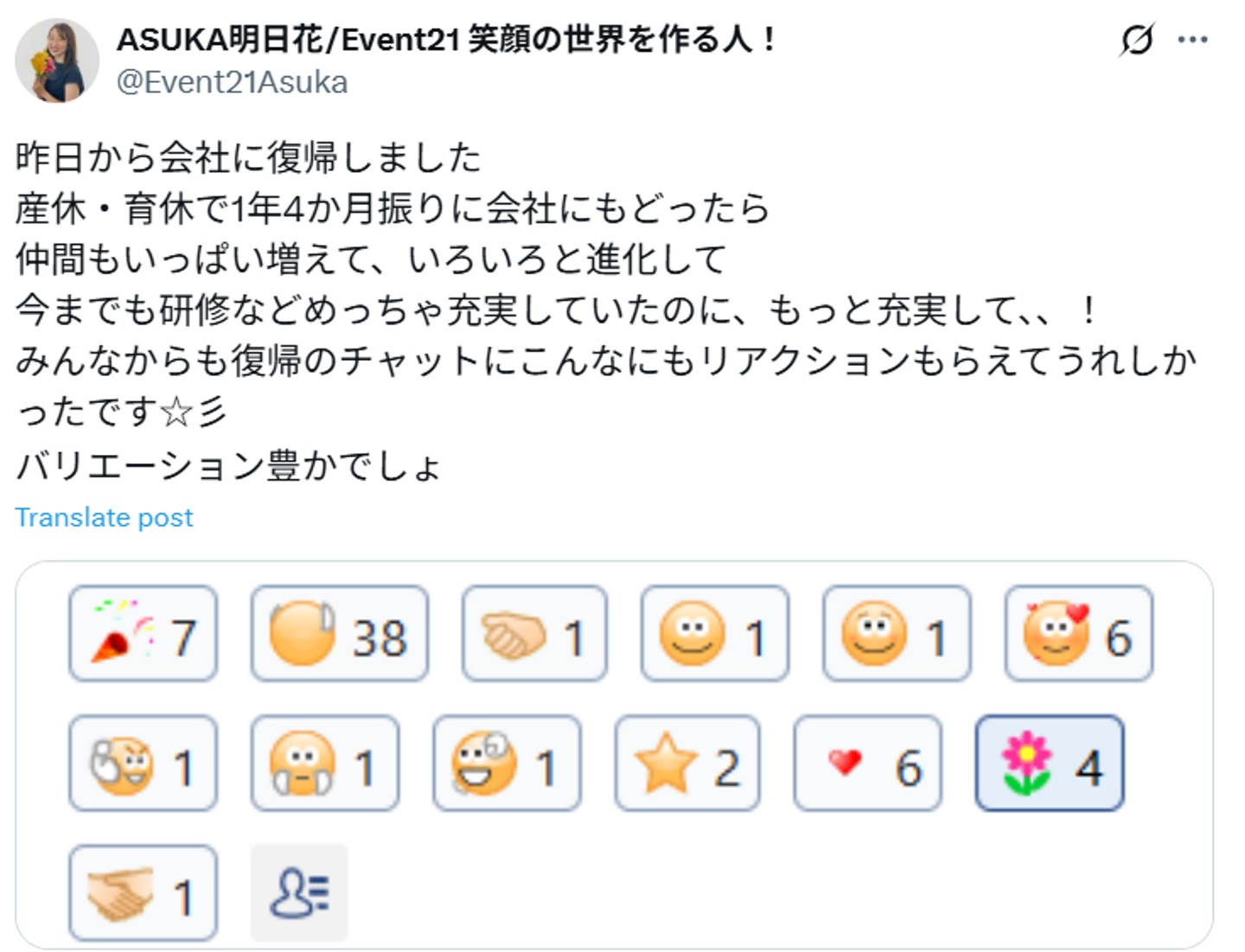 晴れて復帰後、社内のチャットに挨拶をしたらこんなに!たくさんのリアクションが!