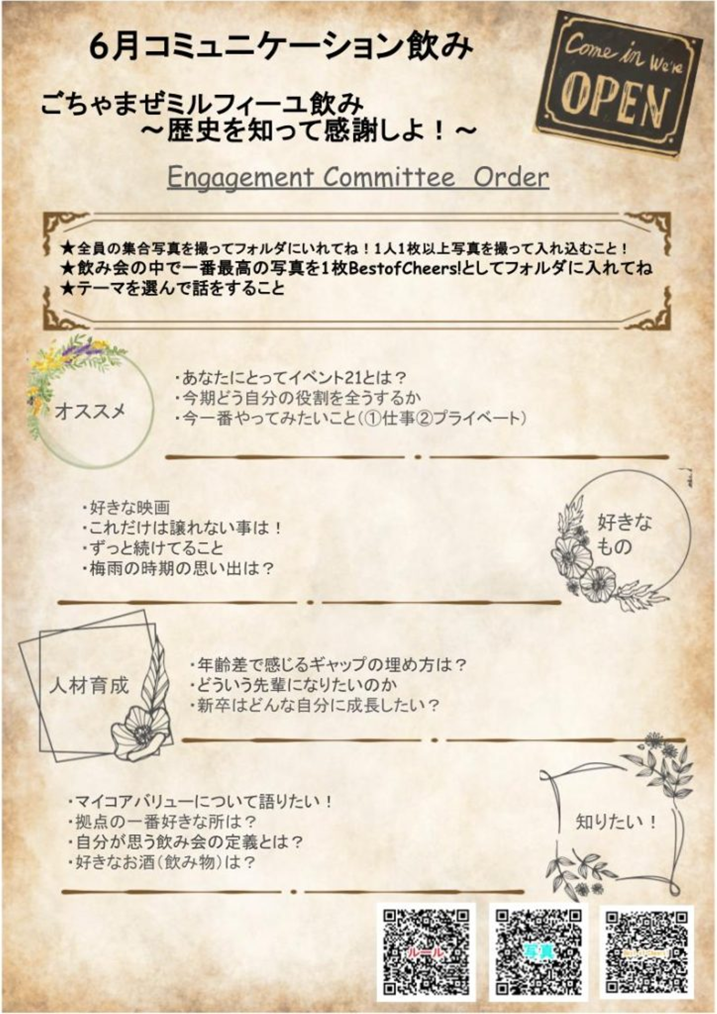 まずコミュニケーション飲みテーマ/メンバーのお知らせが来ます。