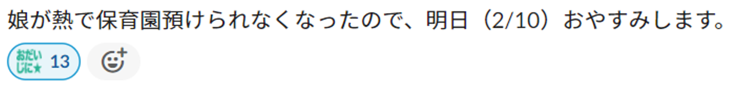 slackで「子供が熱を出したので、今日はお休みします」という連絡が入れば、オリジナルの「おだいじに★」スタンプが押されます。