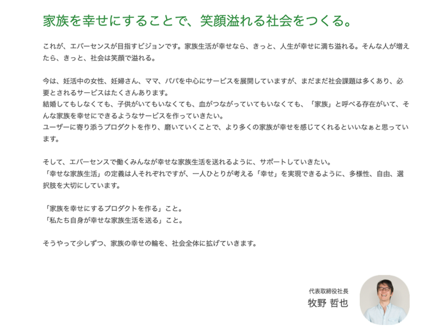 エバーセンスのビジョンは、「家族を幸せにすることで、笑顔溢れる社会をつくる」こと。