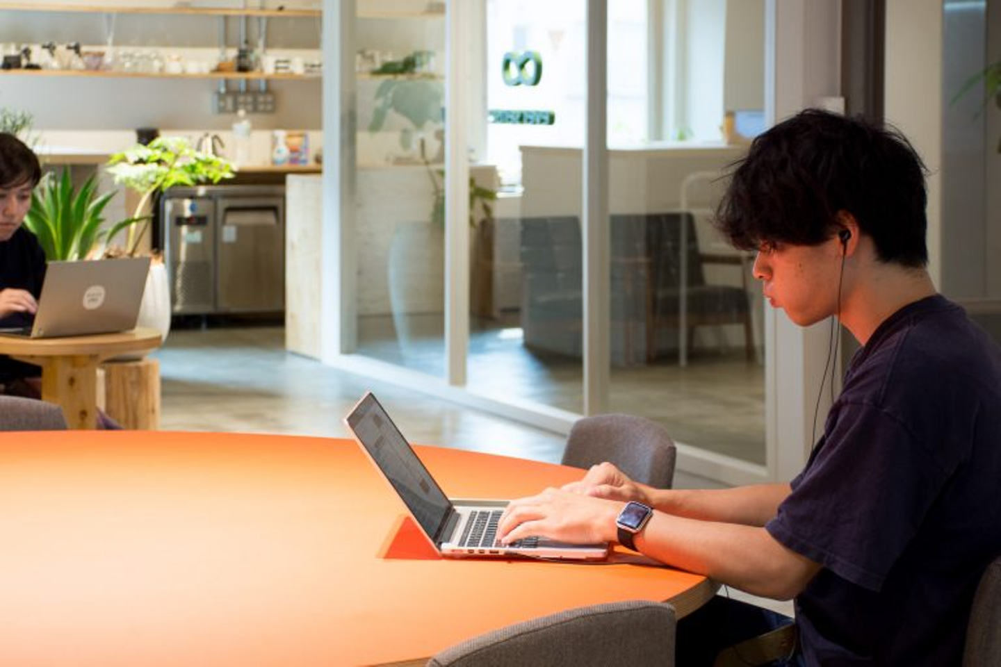 今日もイヤホンをつけ、もくもく作業する新卒入社のコーギー。