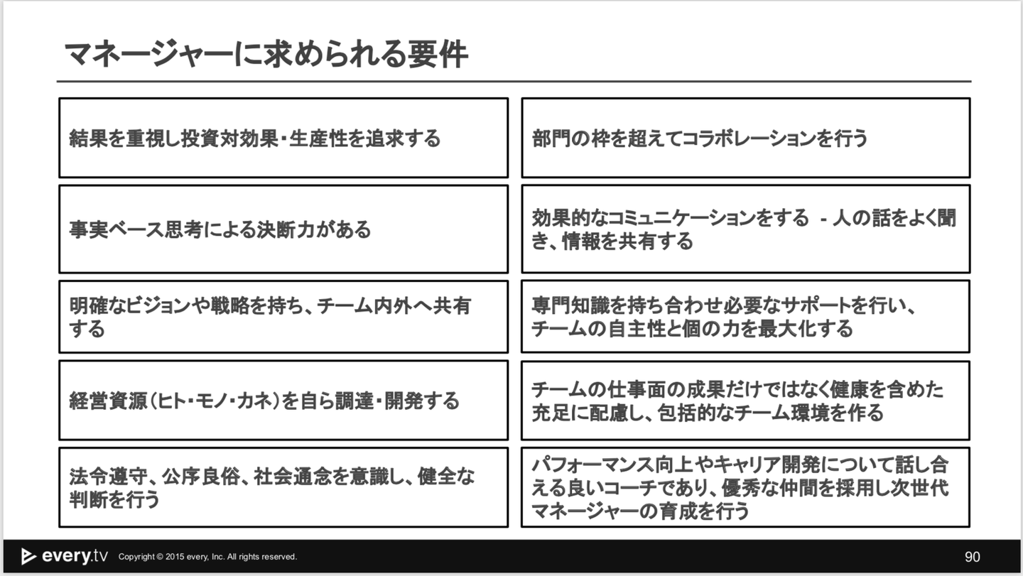 今までマネージャー向けの研修は行なってきましたが、エブリーとしてマネージャーは何をするべきかという行動基準は定められておらず、各自の判断に委ねられていました。組織も拡大し、マネージャーの数も増えてきたため、マネージャー陣が一枚岩となって組織運営が行えるよう、エブリーとしてマネージャーに大切にしてもらいたい、体現してもらいたい価値基準の認識を統一する必要が高まりました。そこで、会社として目指したいマネージャーのあるべき姿として「マネジメントプリンシパル」を定めました。