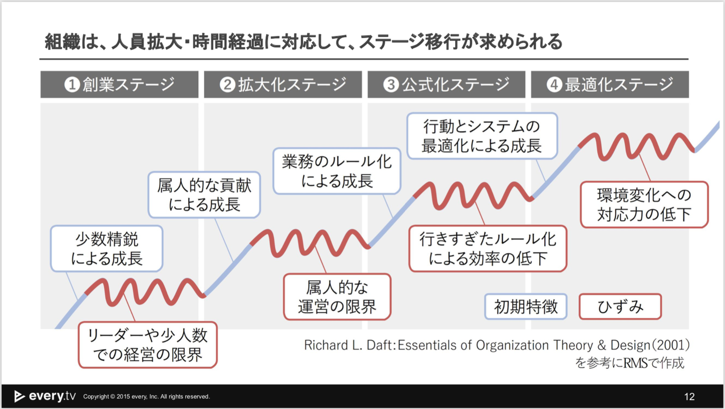 中西:組織の発展モデルは、下図のように4段階のステージに分かれると言われています。エブリーは複数の事業を運営するなかで、”正社員100人、従業員300人”の組織規模になってきており、今は拡大化ステージの中盤です。人事から客観的に組織を見ると、この時期にひずみは発生し得るものであり、乗り越えなければなりません。これからエブリーでも少しずつひずみが出始め、これを少しでも早く解消して公式化ステージへとシフトすることが重要です。そのためには今までのやり方を変えることも必要だと考えています。
