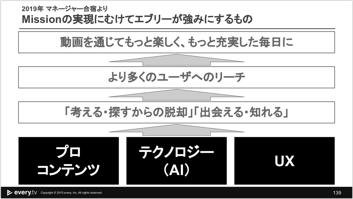 吉田からは「ROAD TO 2025」と題し、これから市況がどう変わっていき、我々エブリーとしてどう変わっていく必要があるのか、2025年に向けてのビジョンを語ってもらいました。エブリーは、「動画を通じてもっと楽しく、もっと充実した毎日に」をミッションとしています。より多くの人に必要とされる生活必需品サービスとなるために、我々が強みにしていくべきは、嘘や間違いのない「プロコンテンツ」であること、最新の「テクノロジー(AI)」を取り入れること、そして新しい「UX」を生み出しお客様に届けていくことです。こうした強みとなるコアコンピタンスの形成に向けてどのような事業投資をしていくのか、といった話をしていただきました。