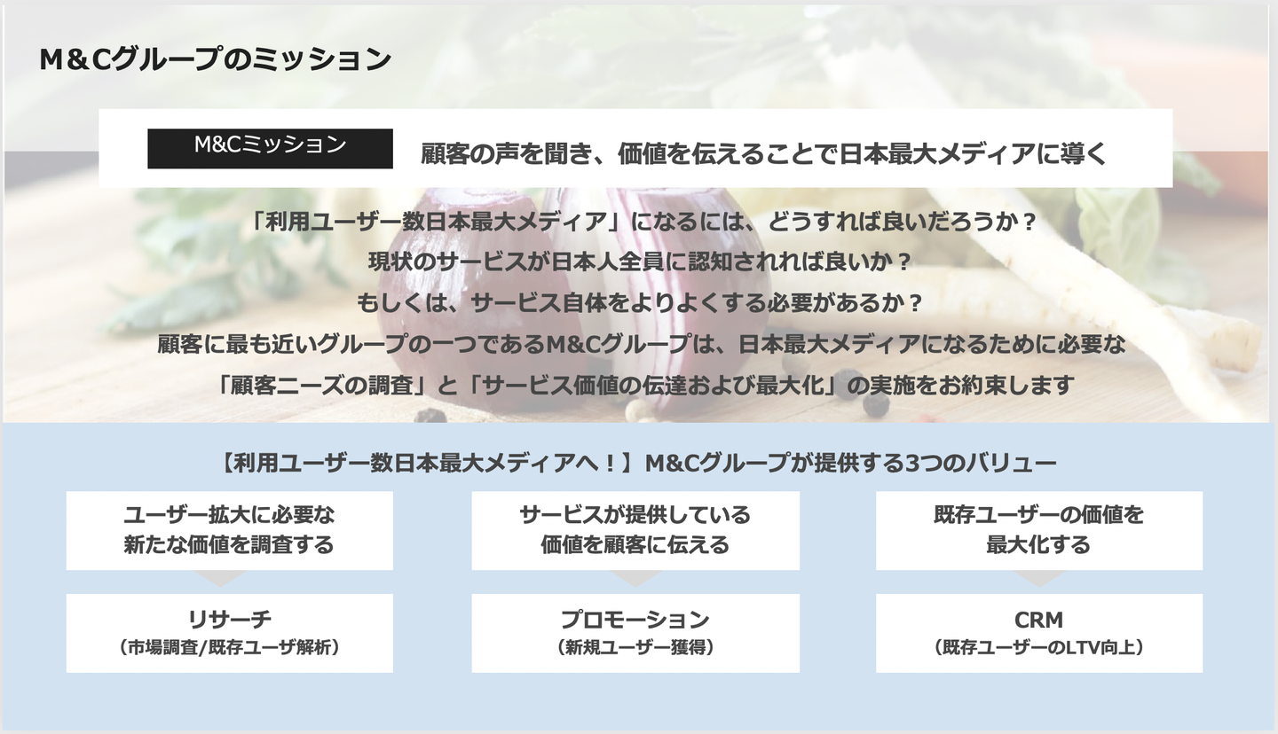 現在はM&Cグループとして、大きく分けて3つのバリューを掲げています。エブリーがやっている事業において、ユーザーはどんな客層なのかを明らかにしていくリサーチの領域と、そのユーザーをいかに獲得していくかのプロモーションの領域、ユーザーによりサービスを使ってもらえるようにしていくCRMの領域にわけ、それぞれミッションを掲げてコミットできるようにしています。