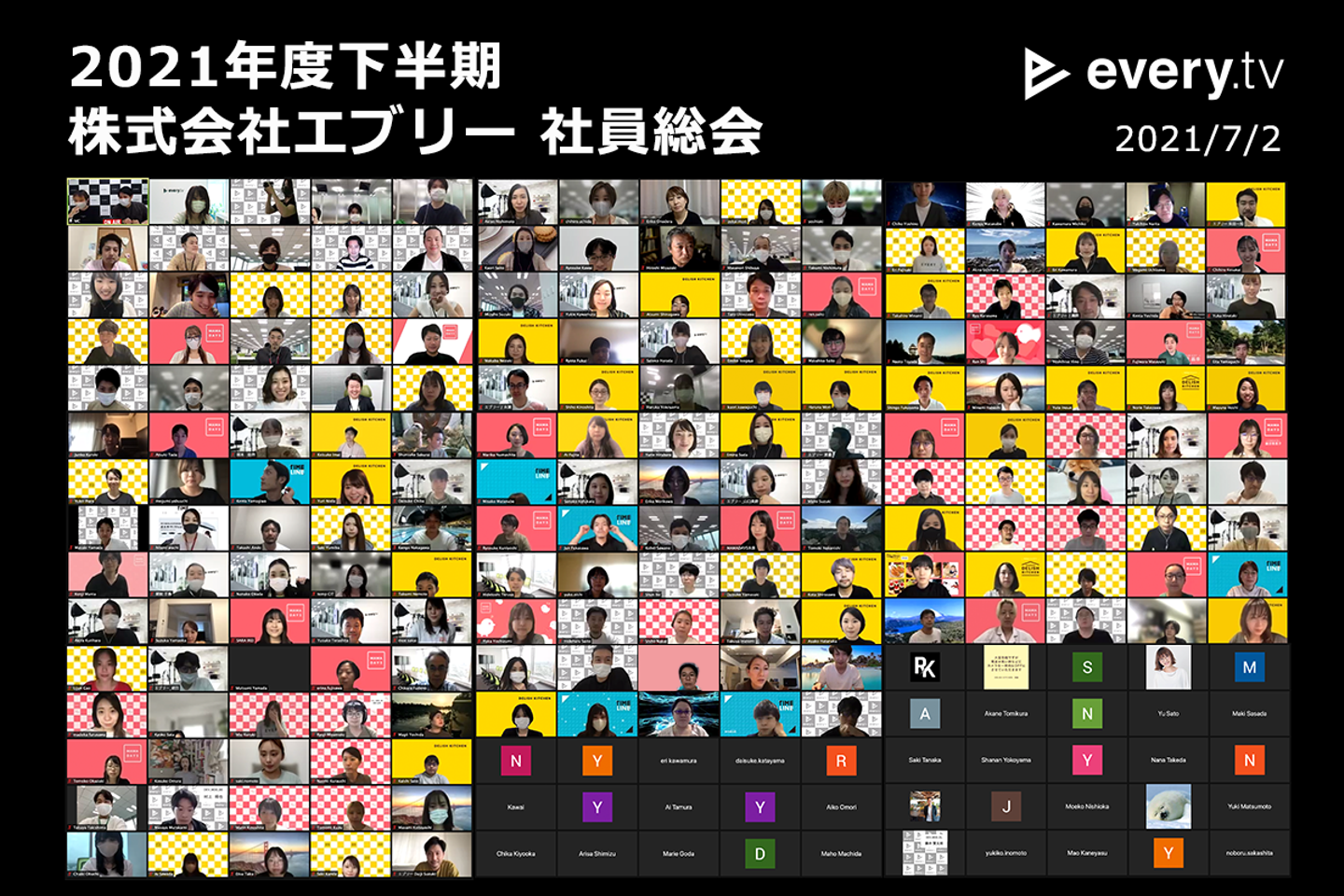 エブリーでは半年に1度、社員総会を実施しています。7月2日、エブリー2021年度下半期の社員総会も、もちろんオンラインで開催!功績が認められた個人およびプロジェクトに対する表彰式を行ったほか、メンバー全員でこの半期を振り返りました。