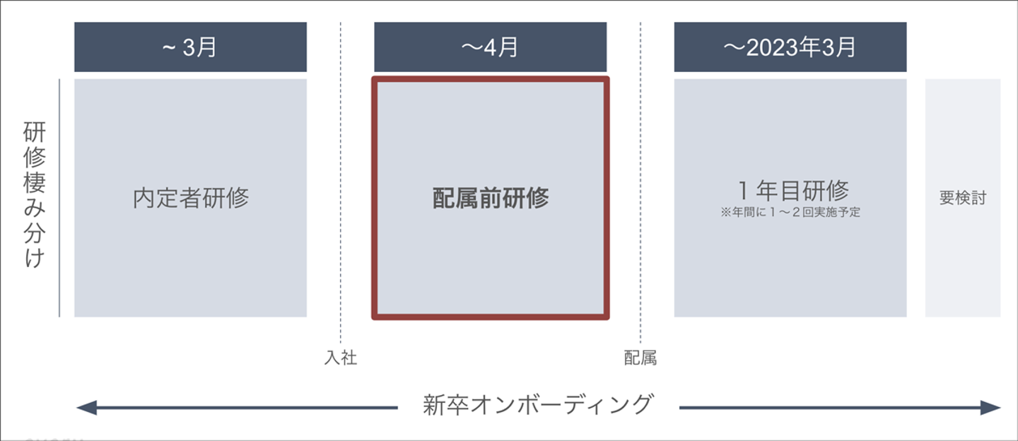 午後には早速、新卒オンボーディング研修も行われました。新卒オンボーディング研修は、内定者研修からはじまり、入社1年後の3月まで定期的な研修を行いトータル的なサポートを行うプログラムです。
