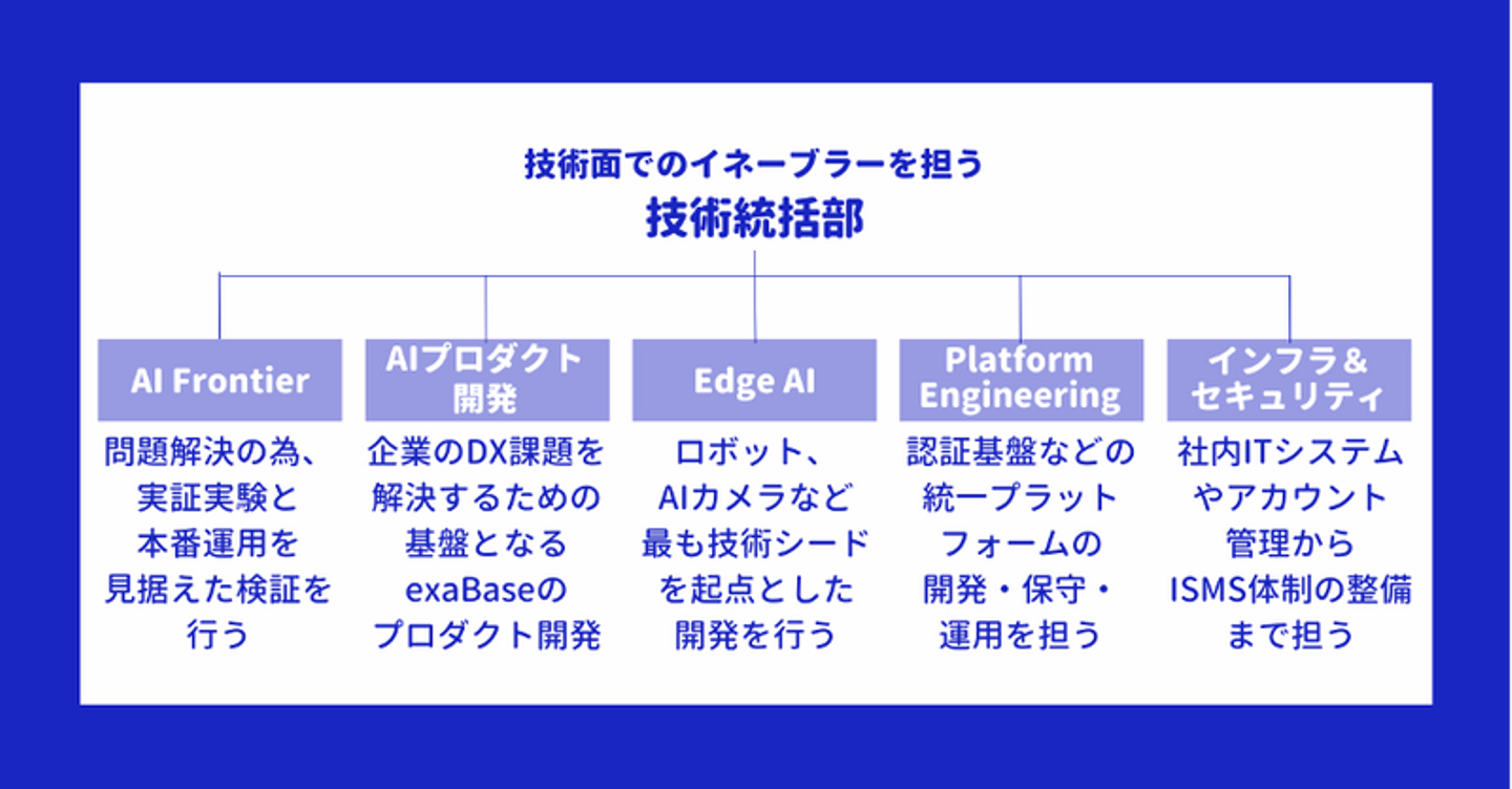 組織的には、技術統括部はAI Frontier、AIプロダクト開発、Edge AI、Platform Engineering、そしてインフラ&セキュリティの5つの部から構成されます。