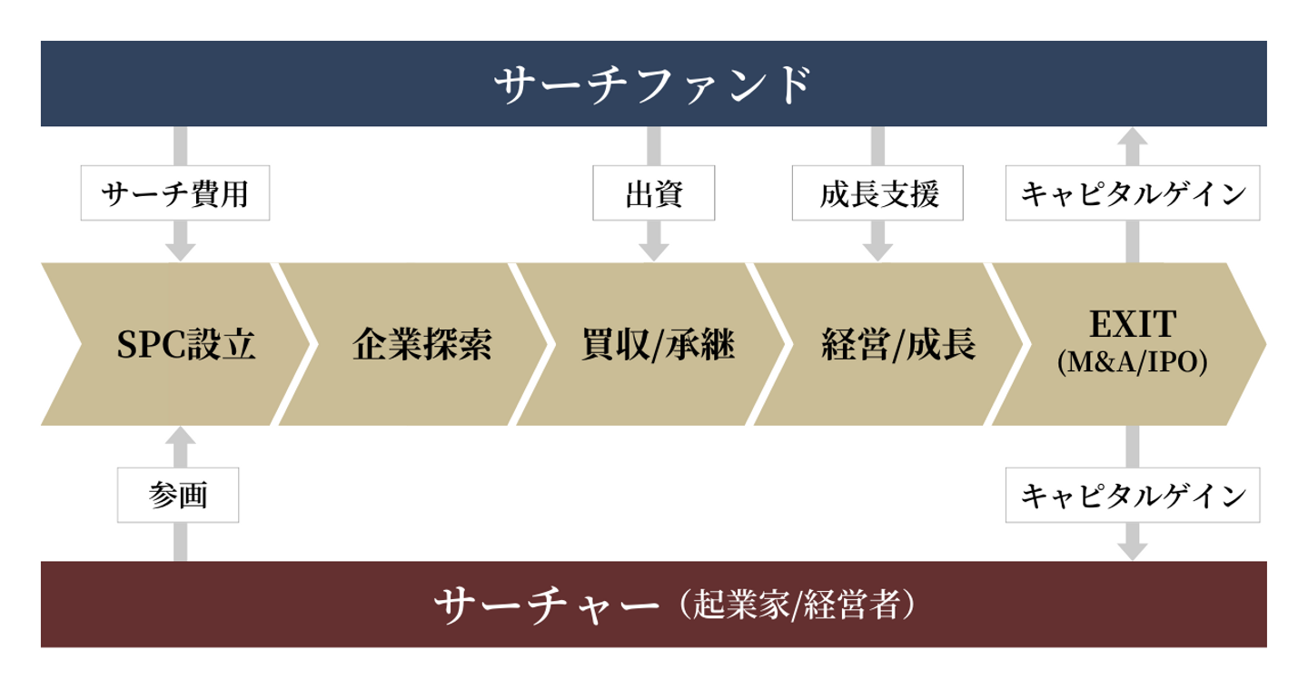 サーチファンドは、起業家/経営者(以下、サーチャー)が中小企業を探索(サーチ)し、資金提供などのサポートを受けて買収を通じて事業を承継し、成長のための経営を行う仕組みです。優秀な経営者候補と事業承継が必要な中小企業をつなぐ、日本では比較的新しく社会的意義の高い投資手法の一つです。サーチファンドは、1984年に米国のビジネススクールで誕生したと考えられており、近年では設立が世界中で拡大しています。