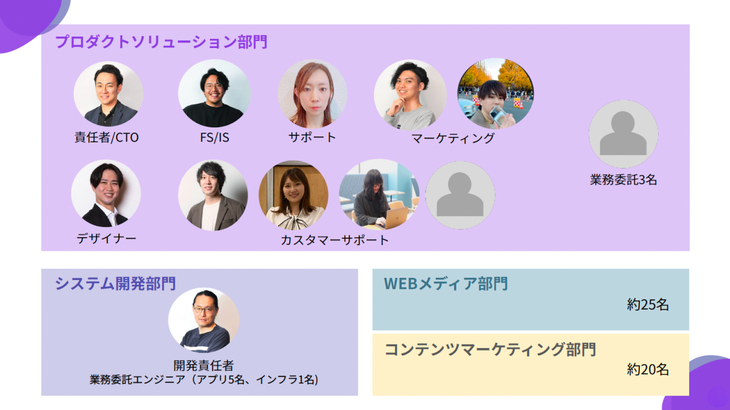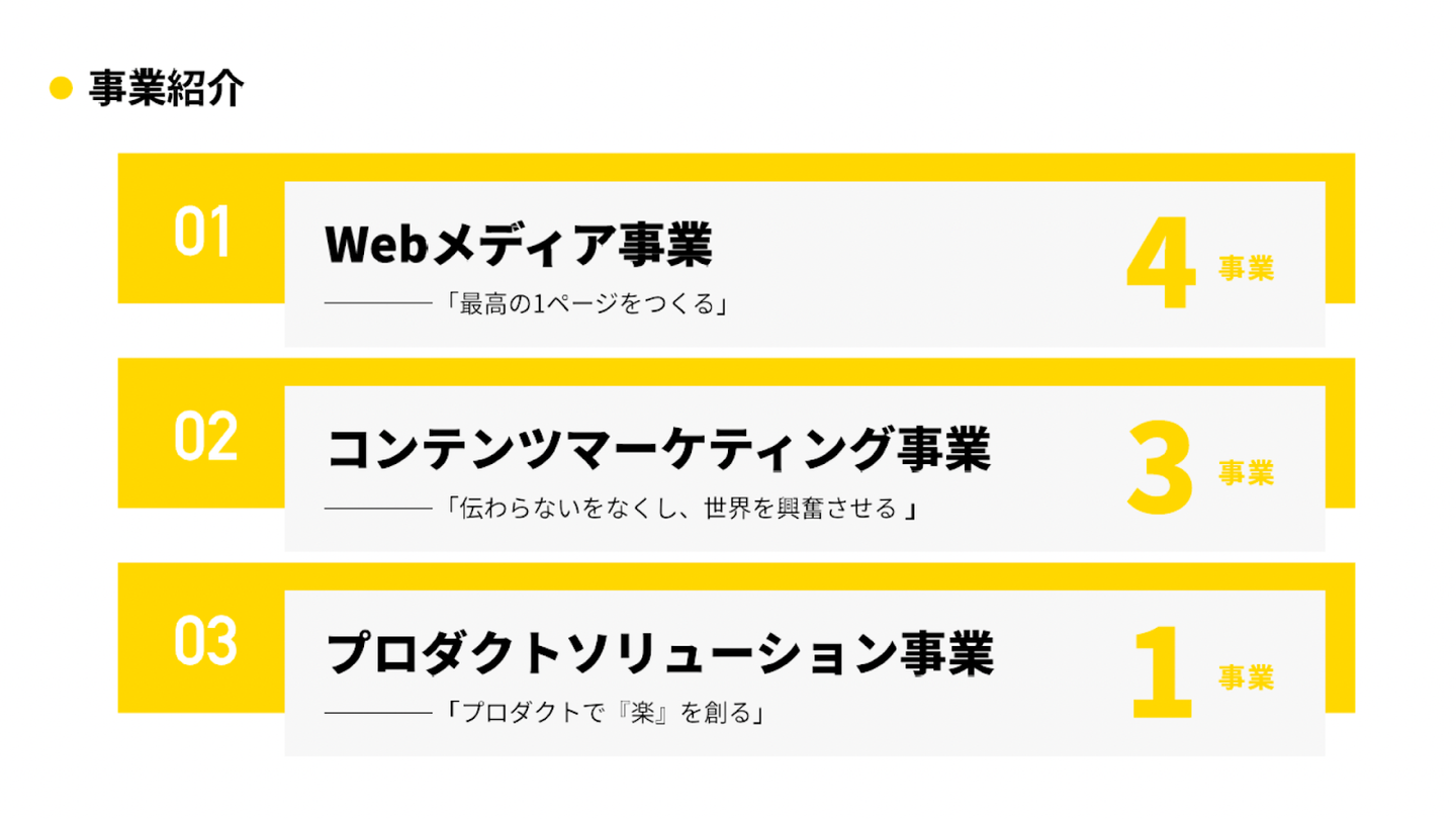 事業は全部で3部門を展開しています。創業時からの「Webメディア事業」、その次に立ち上げた「コンテンツマーケティング事業」では、コンサルティングや制作物を提供しています。「プロダクトソリューション事業」は、生成AIとSEOを組み合わせたツールを提供しており、広く言えばマーケティングDXの機能を持っているSaaSのイメージです。