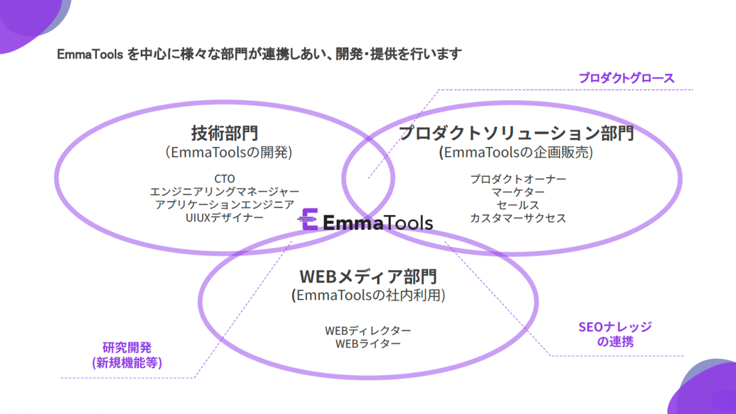 Emma Toolsを中心に、各部門と連携を取りながらプロジェクトを進めています。