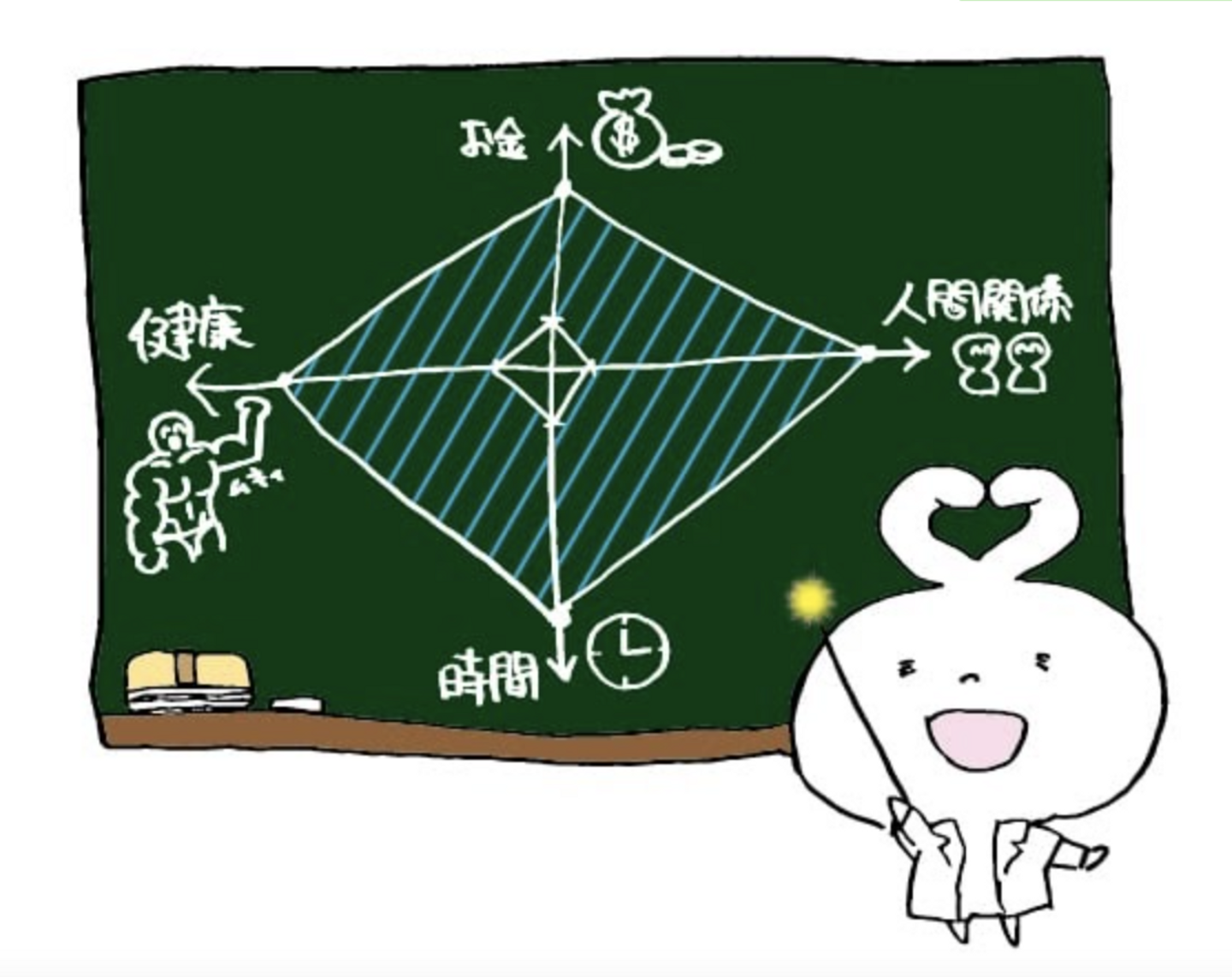 Peachの考える人生の豊かさの指標は4つあります。それは、お金、時間、健康、人間関係です。
