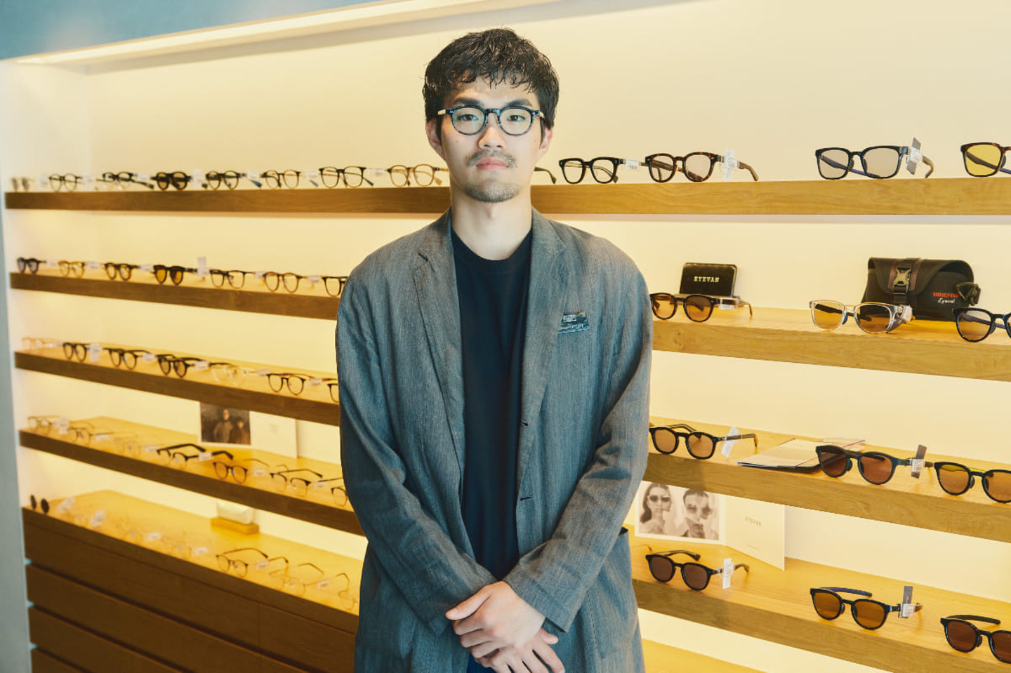 「敷居を低く見せているわけではなく、かと言って昔ながらの高級なメガネ屋さんのようにフォーマルなわけでもない、ユニークな雰囲気ですよね。かっちりとなりすぎず、ファッション性を多く取り入れることで、 ”着るメガネ” というEYEVANのメガネの楽しみ方を、スタッフ自身も体現しているように思います。」