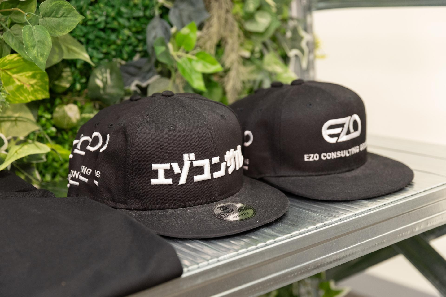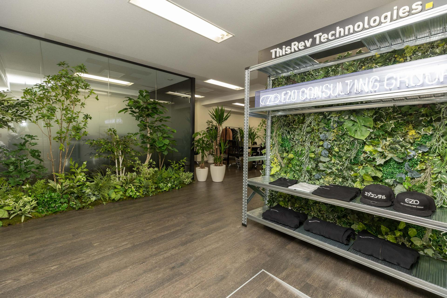 杉下「オフィスって無機質なアイテムに偏りがちだけど、緑が目に入るとリフレッシュできていいよね。会社のロゴ入りTシャツやキャップなどの暗めのアイテムや看板、ラックなどでメリハリもついて、トレンド感も演出できていると思います。」