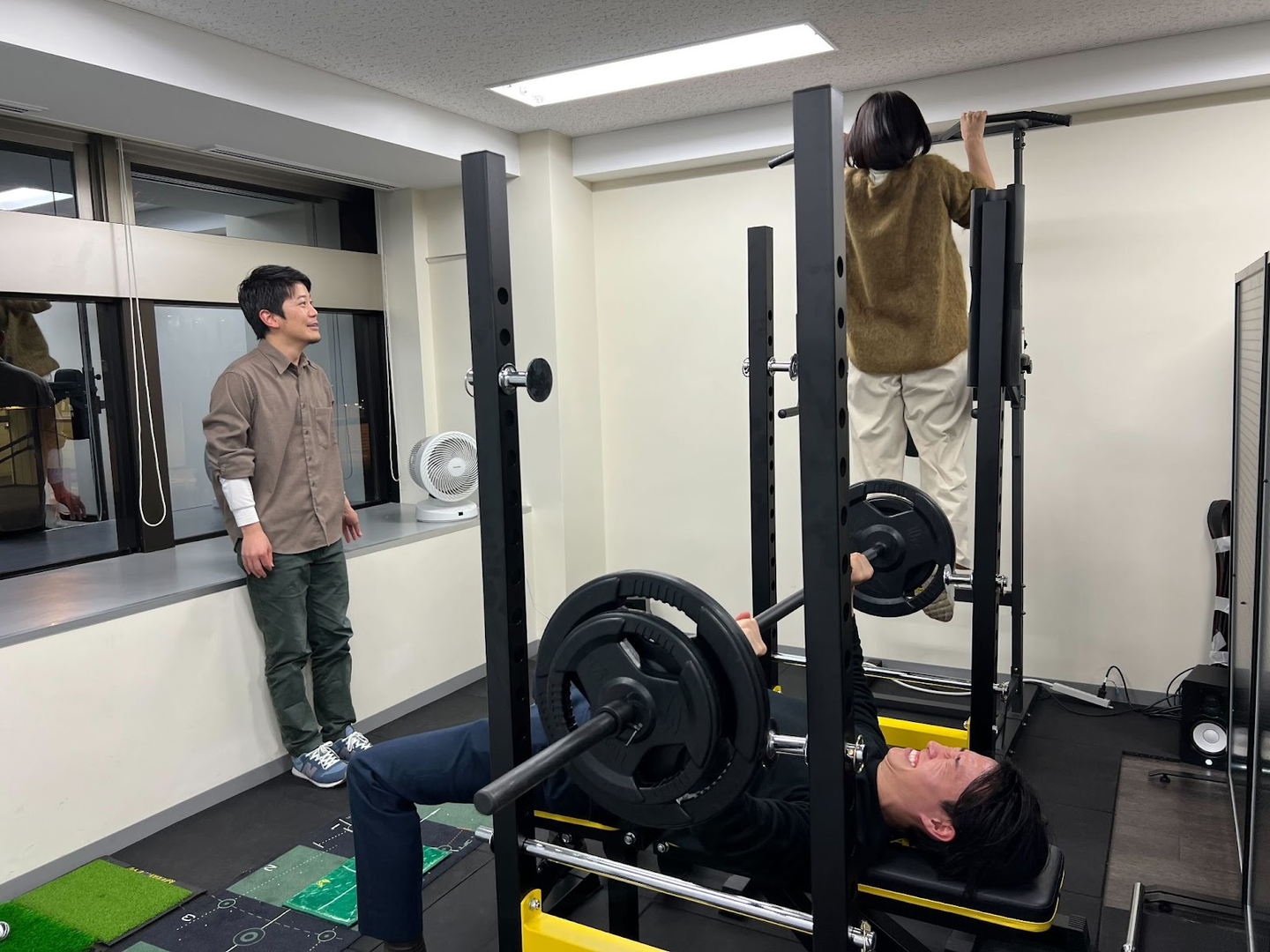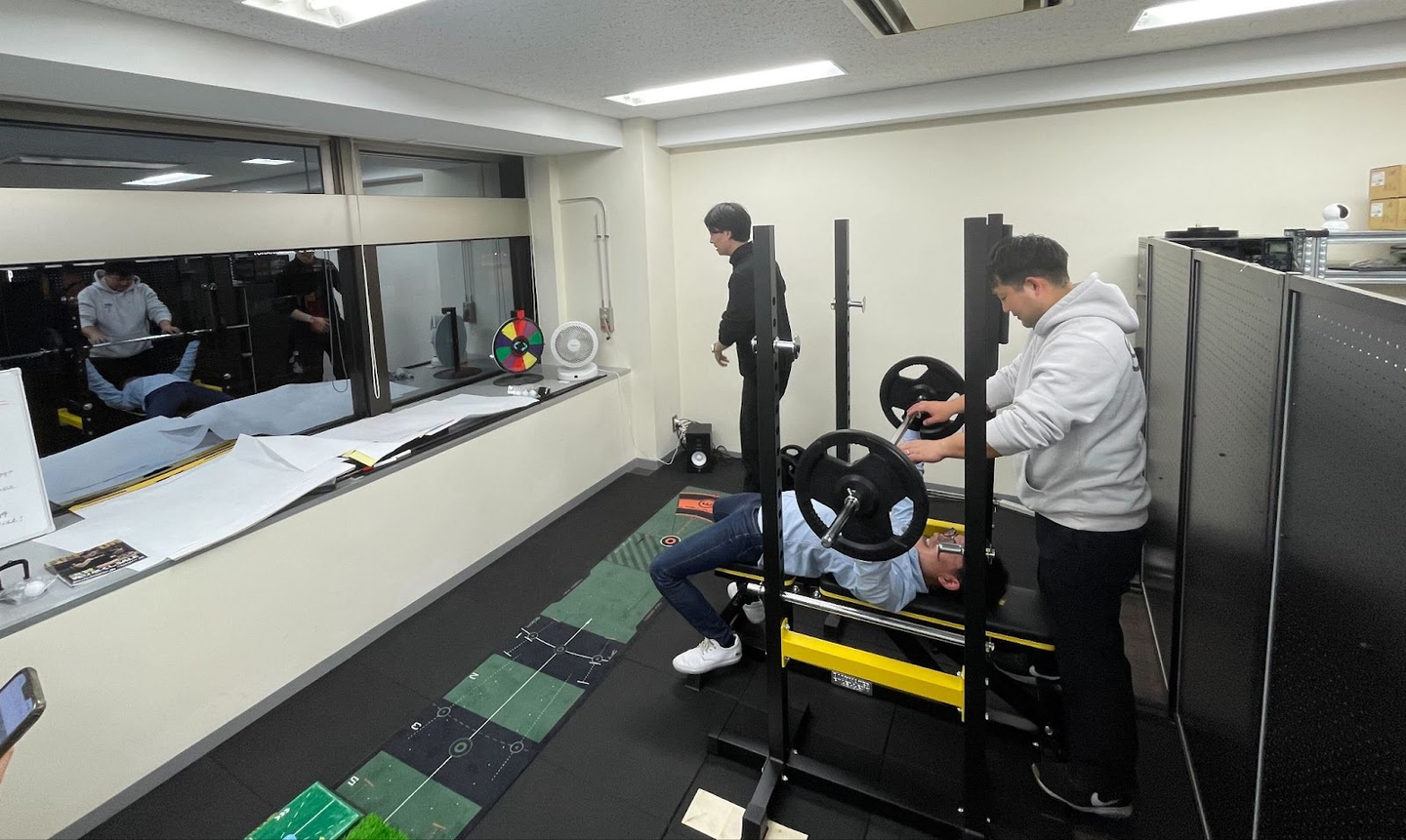 取材後にベンチプレス台や懸垂バーなどが届き、フィットネススペースが充実してきた模様です。早速使っている様子がSlackにアップされていました。