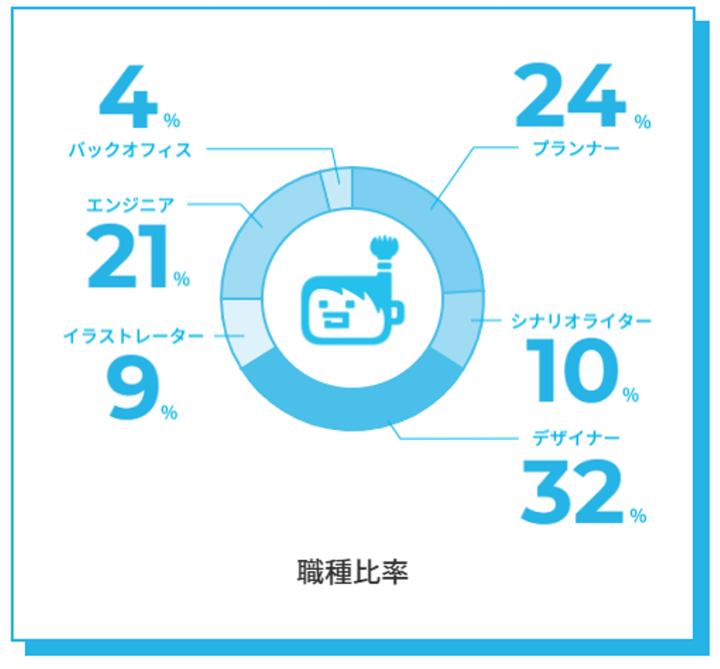 職種の構成比率は多い順に、デザイナー32%、プランナー24%、エンジニア21%、シナリオライター10%、イラストレーター9%、バックオフィス4%となっています。