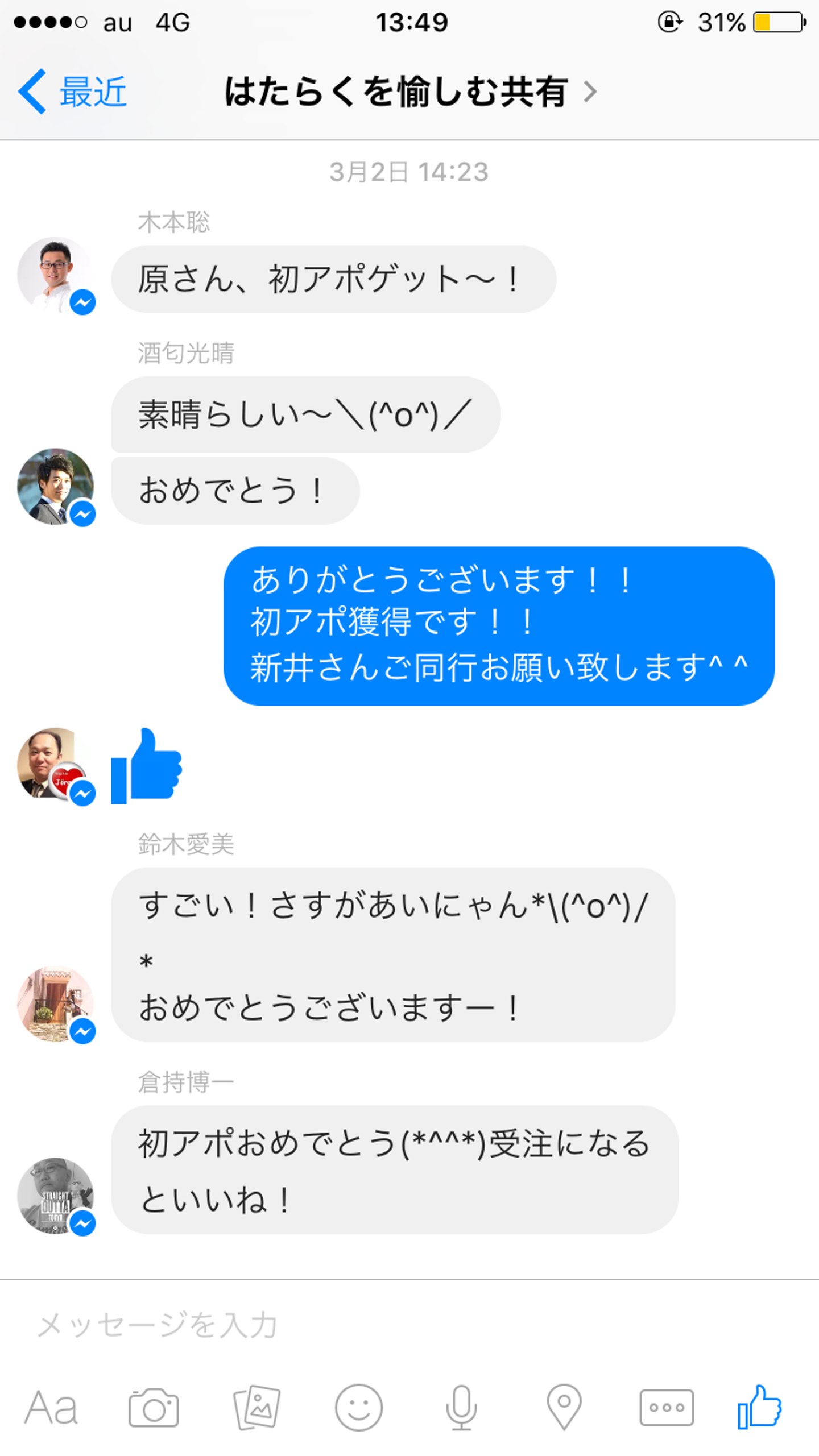 例えば、会社のトークルームに「アポがとれました!!」
