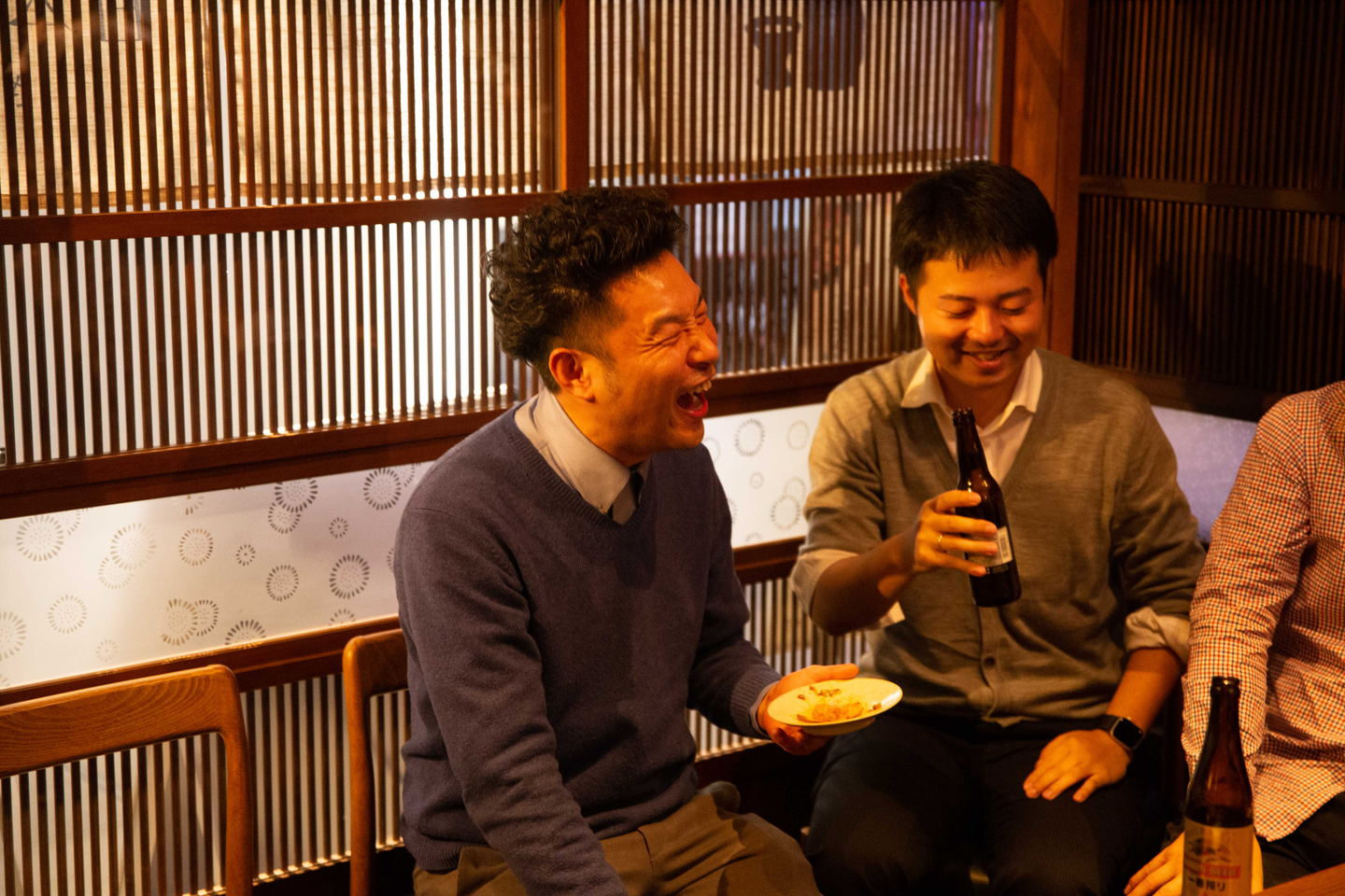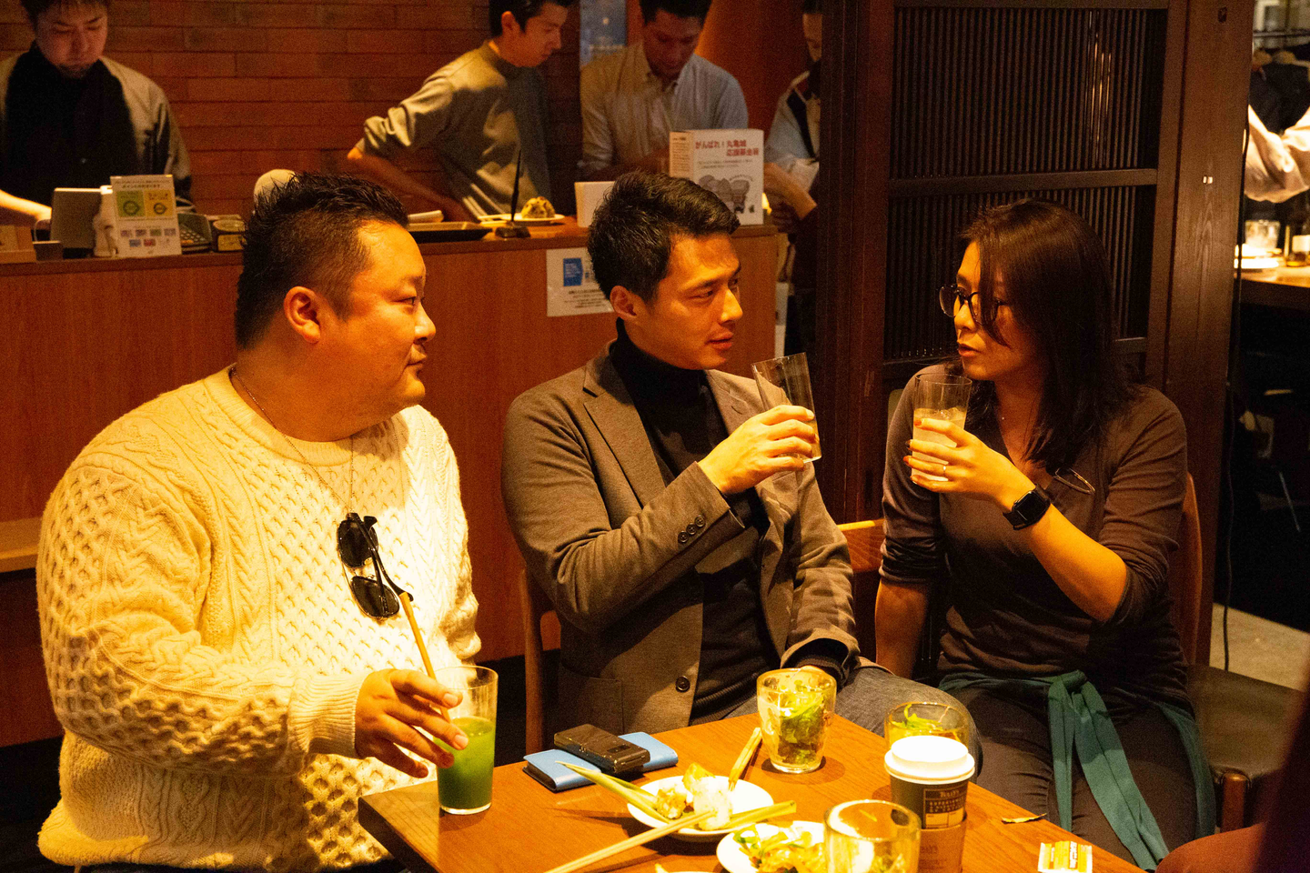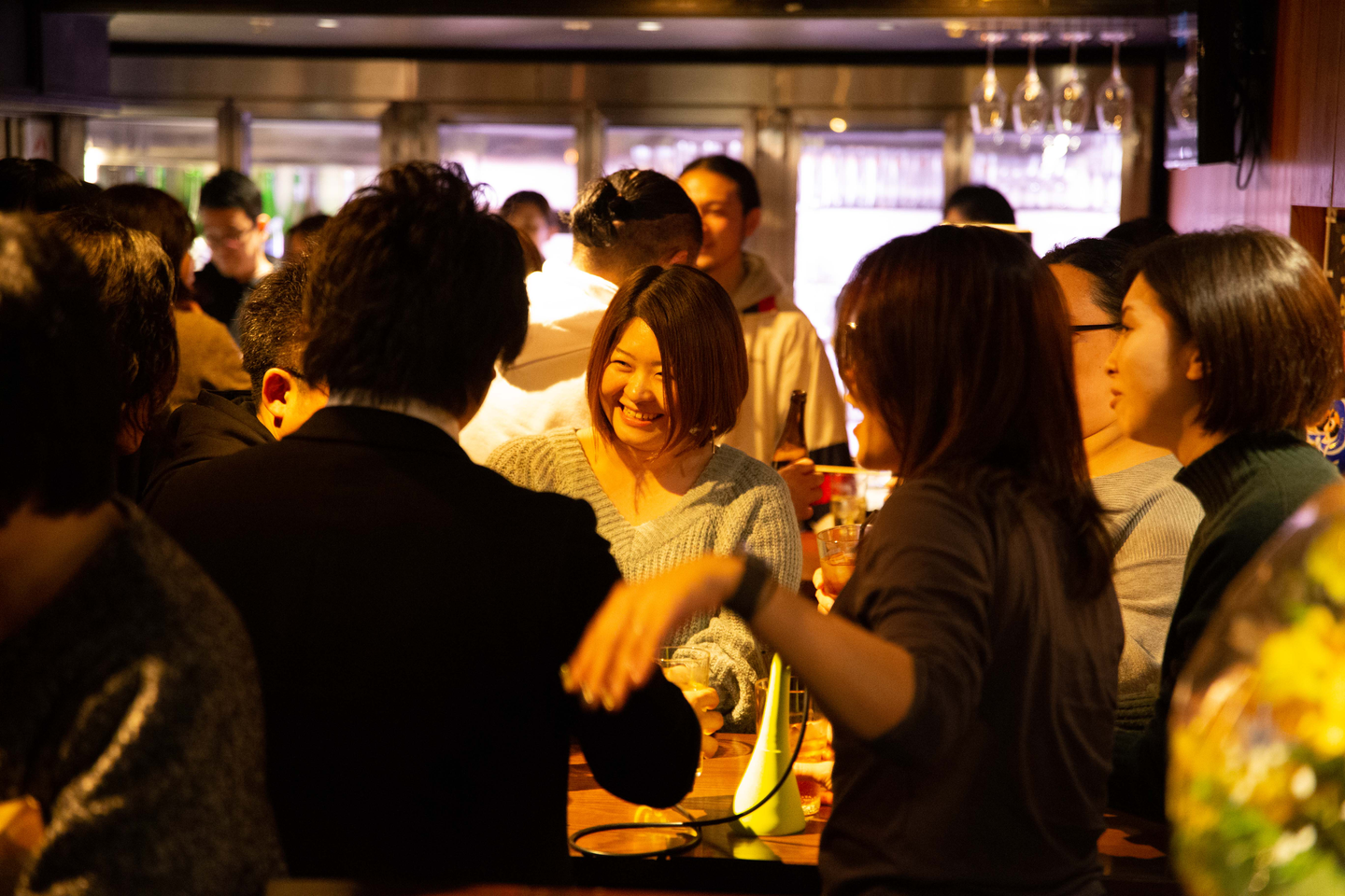仕事が終わって、忘年会会場に集まるメンバーたち。