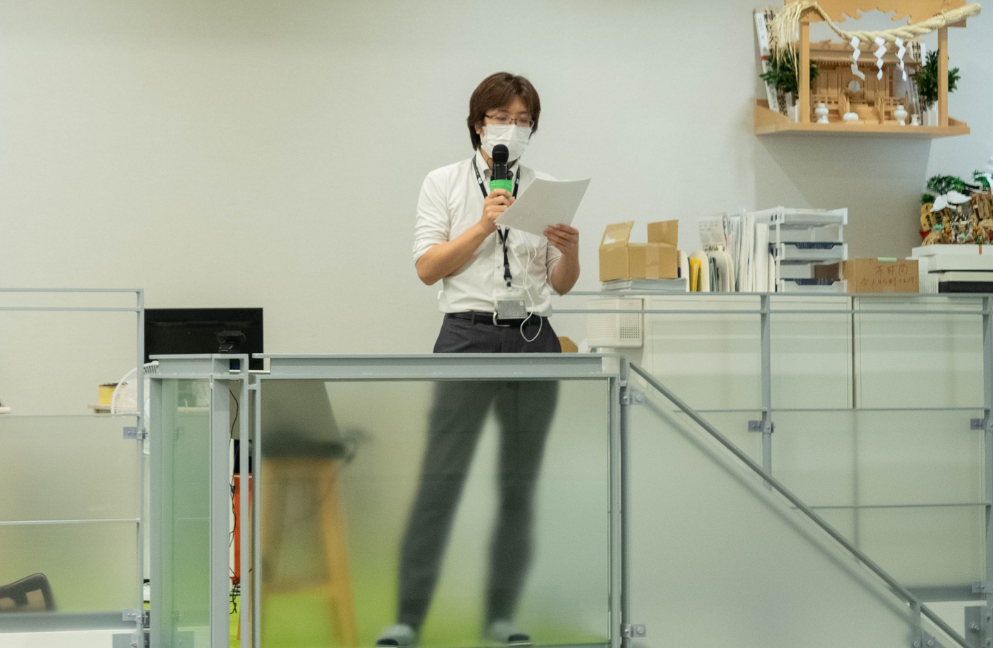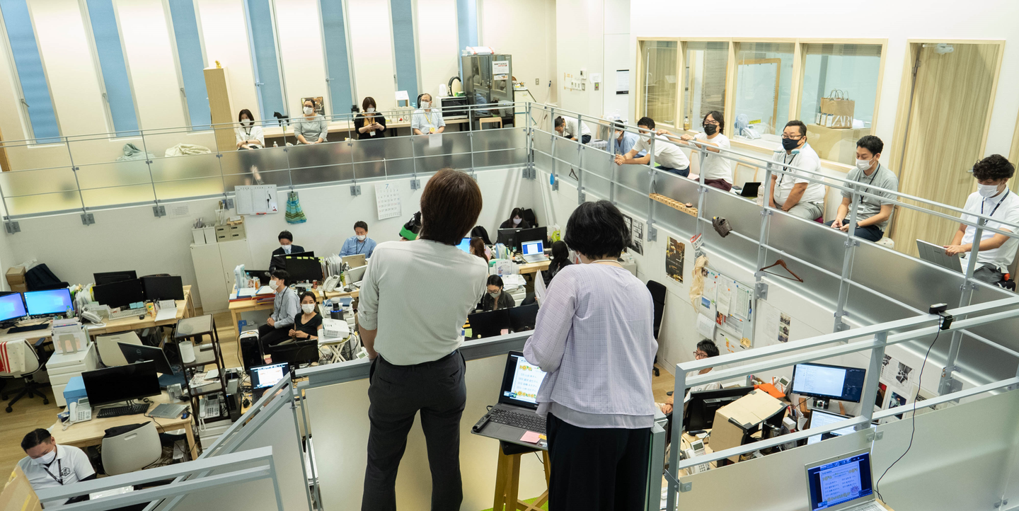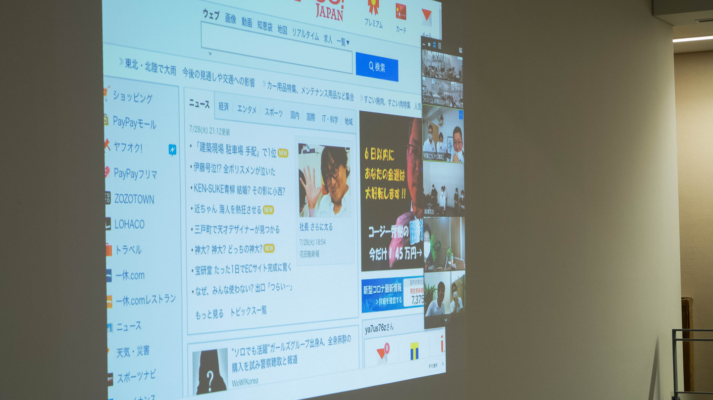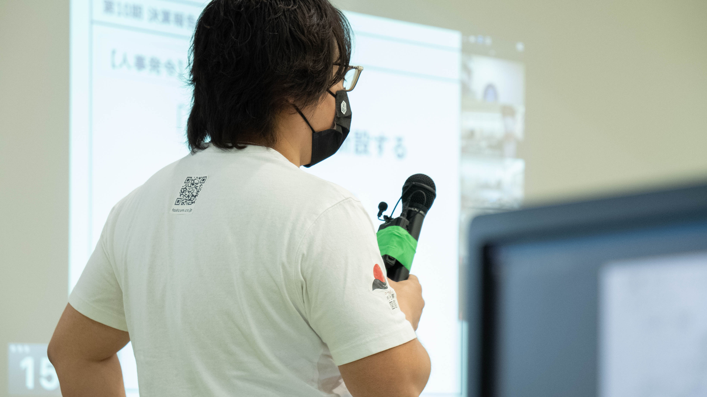 毎月の「全社会」という全員参加の会議で慣れてはきましたが、今回は特に念入りに準備。二層構造で白く大きな壁があるという本社オフィスの設備が役立ちます。