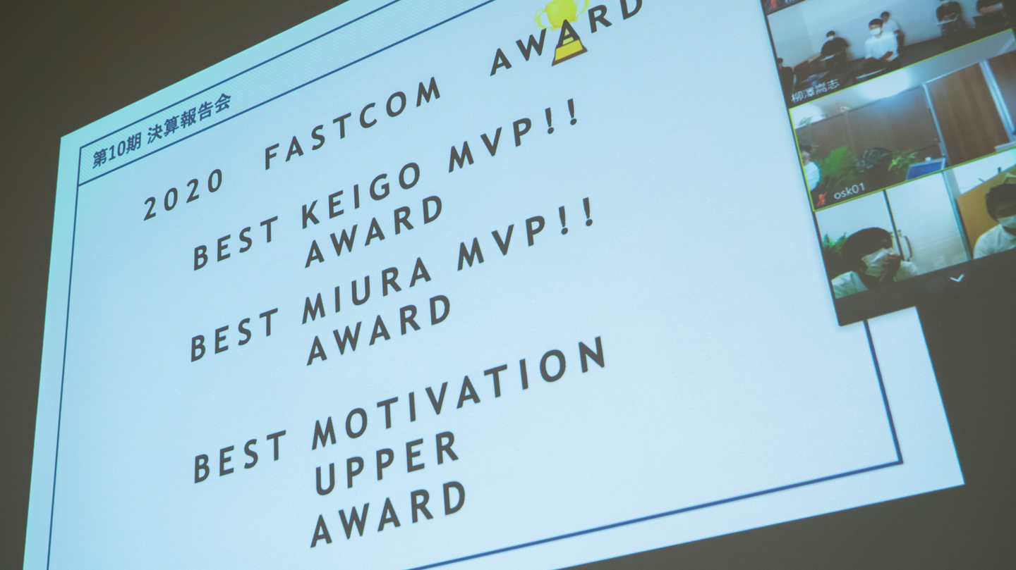 社内の雰囲気作りなどチームワーク醸成への貢献と、企業理念を体現している人として、司会も務めた青柳が選ばれました。
