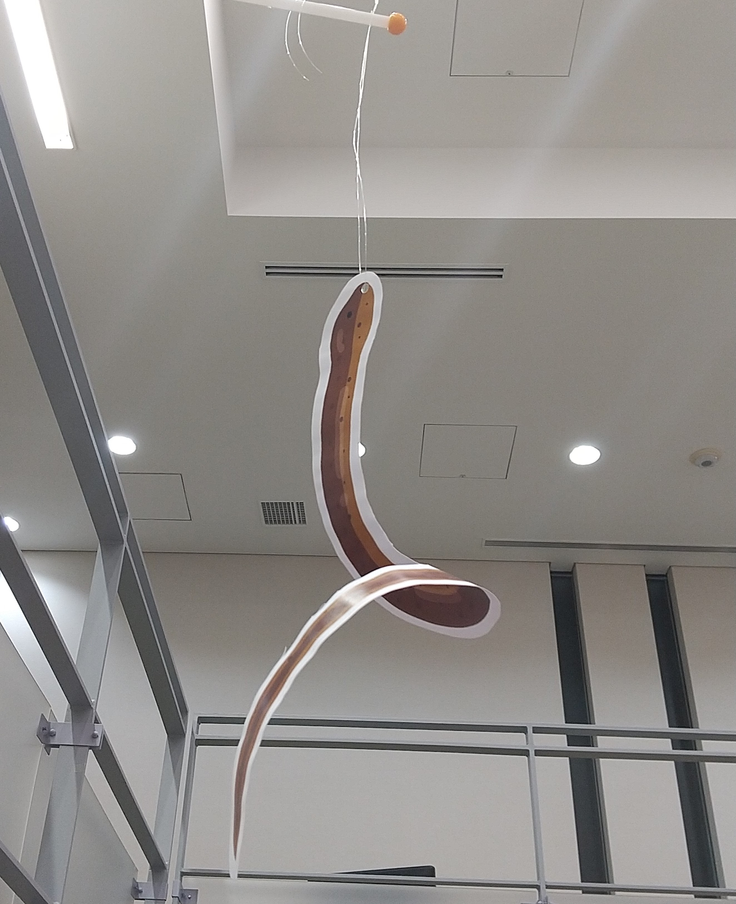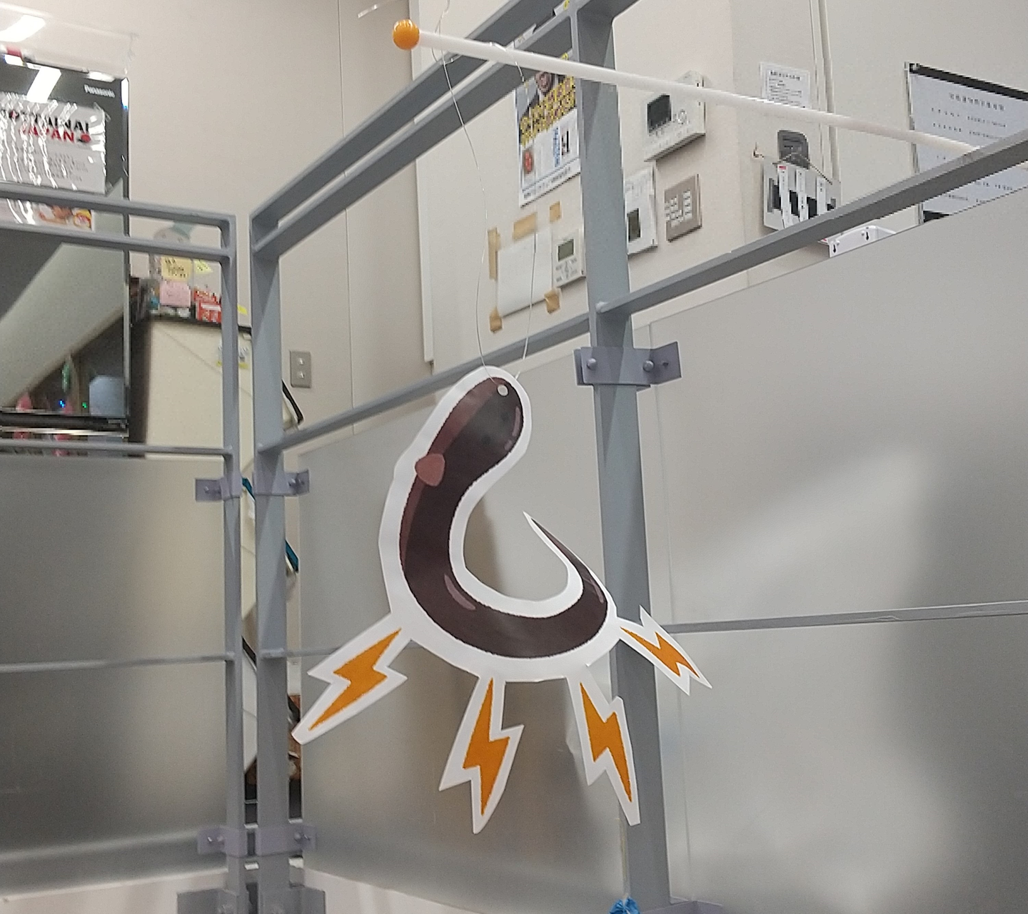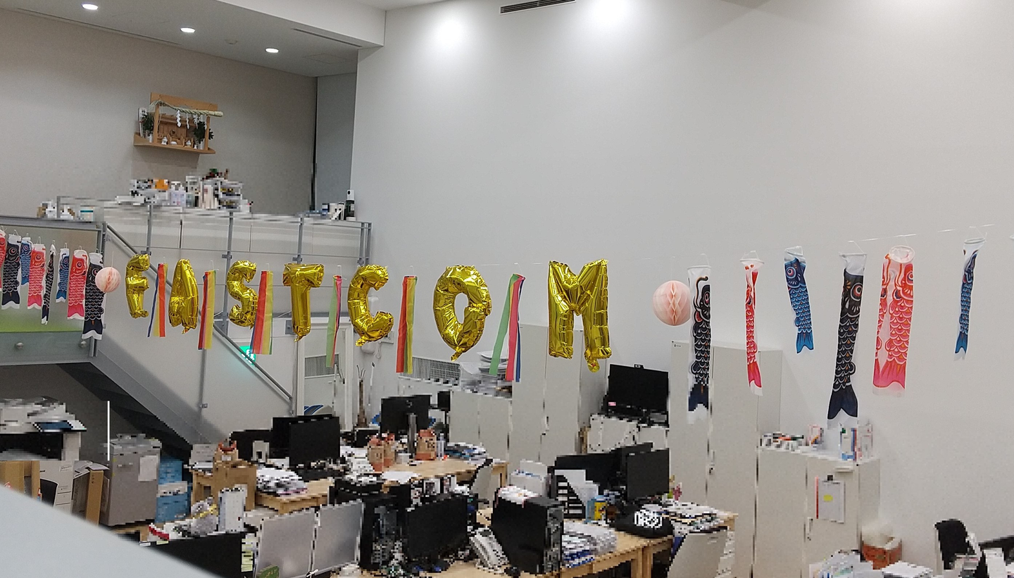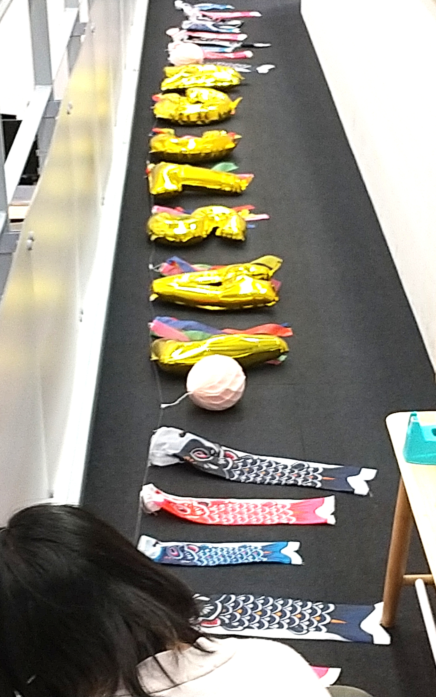 これを活かして中央に社名のバルーンと鯉たちをさげました。