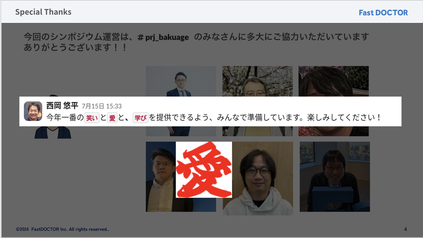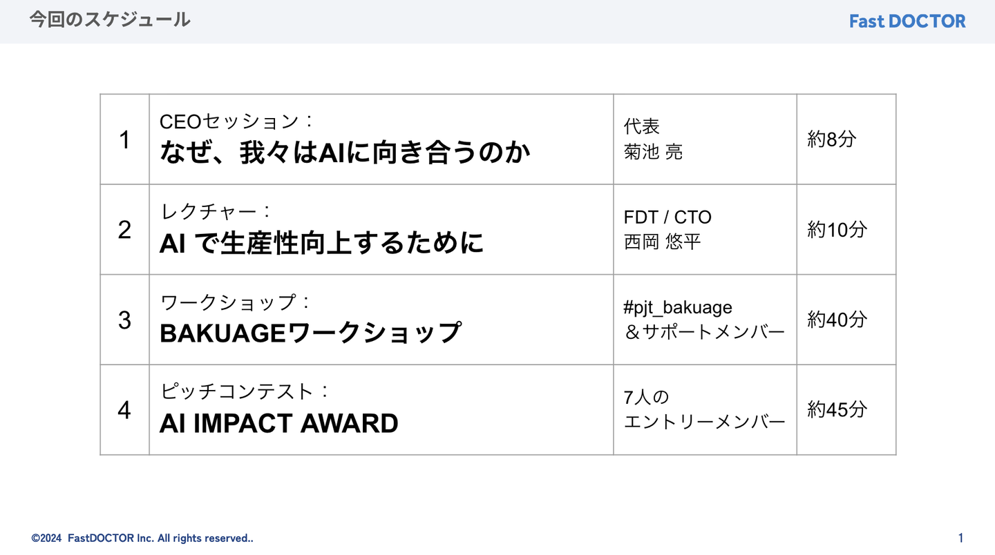 イベントの最後は、代表取締役水野の締めくくり。「ファストドクターでDX/AIのスキルを身につけ、そのスキルを医療業界に還元する。将来、医療の現場に戻ってそういう人材を育成する場になりたい」と述べ、AIによる生産性向上が、日本の医療業界全体への貢献に繋がるというビジョンを示しました。