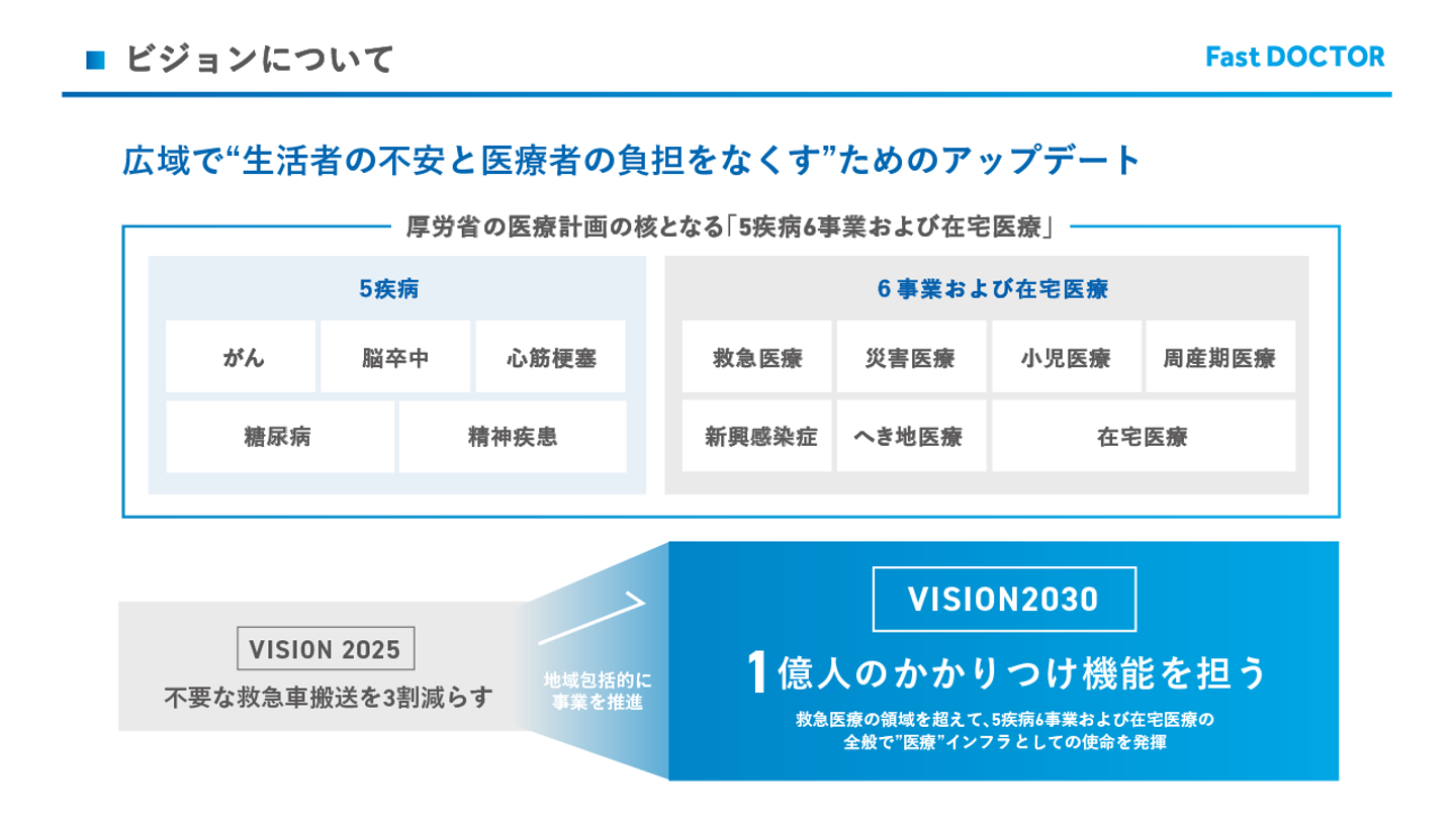 ーービジョン2030では「1億人のかかりつけ機能を担う」をうたっています。これはファストドクターが今後、がん、脳卒中、心筋梗塞などの「5疾病」、救急医療、へき地医療、周産期医療、新興感染症などの「6事業」および在宅医療に取り組むことを宣言したものですが、どうすれば達成できるのでしょうか。