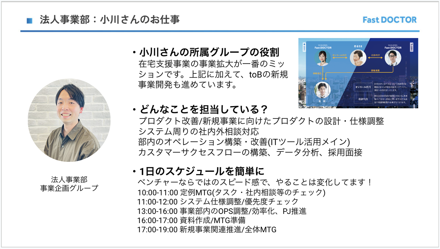 私は在宅医療支援事業を担う法人事業部に所属している小川です。グループの役割として特に今年から加速してきたのは、新規事業開発の部分です。今後は、全国の地域医療を支えられるようなサービスを広げていくところがミッションです。私が担当しているのは、基本的にFDTの方とも関わりつつ、契約している医療機関とファストドクターの間で患者情報の連携を行う自社システムクリニックポータル(※)の改修・改善の要件定義、新規事業の仕様の調整、カスタマーサポートやカスタマーサクセスといわれるフロント業務のフロー設計など。そして、これらの一次情報をもとにプロダクトの改善など、幅広く対応しています。