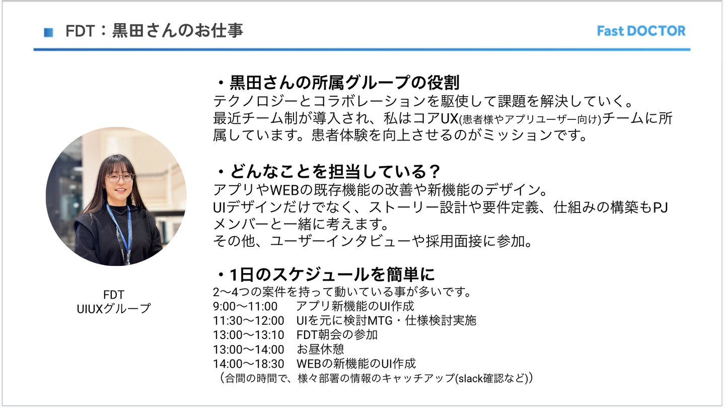私もFDTに所属しているデザイナーの黒田です。現部署では、私を含めて2名の社員がデザイナーとして働いていて、あとは業務委託で他のデザイナーさんにもお力添えをいただいています。最近のFDTではスクワッド(squad)制度という「プロダクトを開発するエンジンとなる存在である、少人数の、自律した、必要な権限を持ったチーム」作りが導入されていて、私はそのなかでもコアUX(患者さんやアプリユーザー向けにユーザーインターフェースを改善する)というチームに所属しています。普段は『Figma(フィグマ)』というデザインツールを使ってアプリの改修・改善などの開発を担当しています。