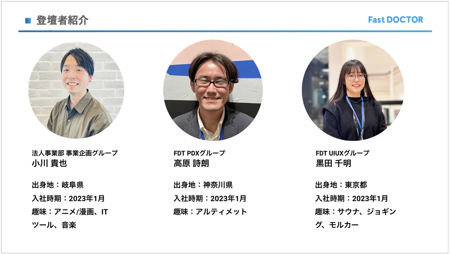 目まぐるしく変化するスタートアップの環境。ファストドクターも現在は事業の成長に伴い、採用を強化し、組織を拡大しているような環境にあります。そのような環境で、新しく入社した社員はどのような仕事に取り組んでいるのか、どのような想いで働いているのでしょうか。今回の記事は、2023年4月24日に行われた入社して半年以内のフレッシュな社員によるミートアップのレポートです。