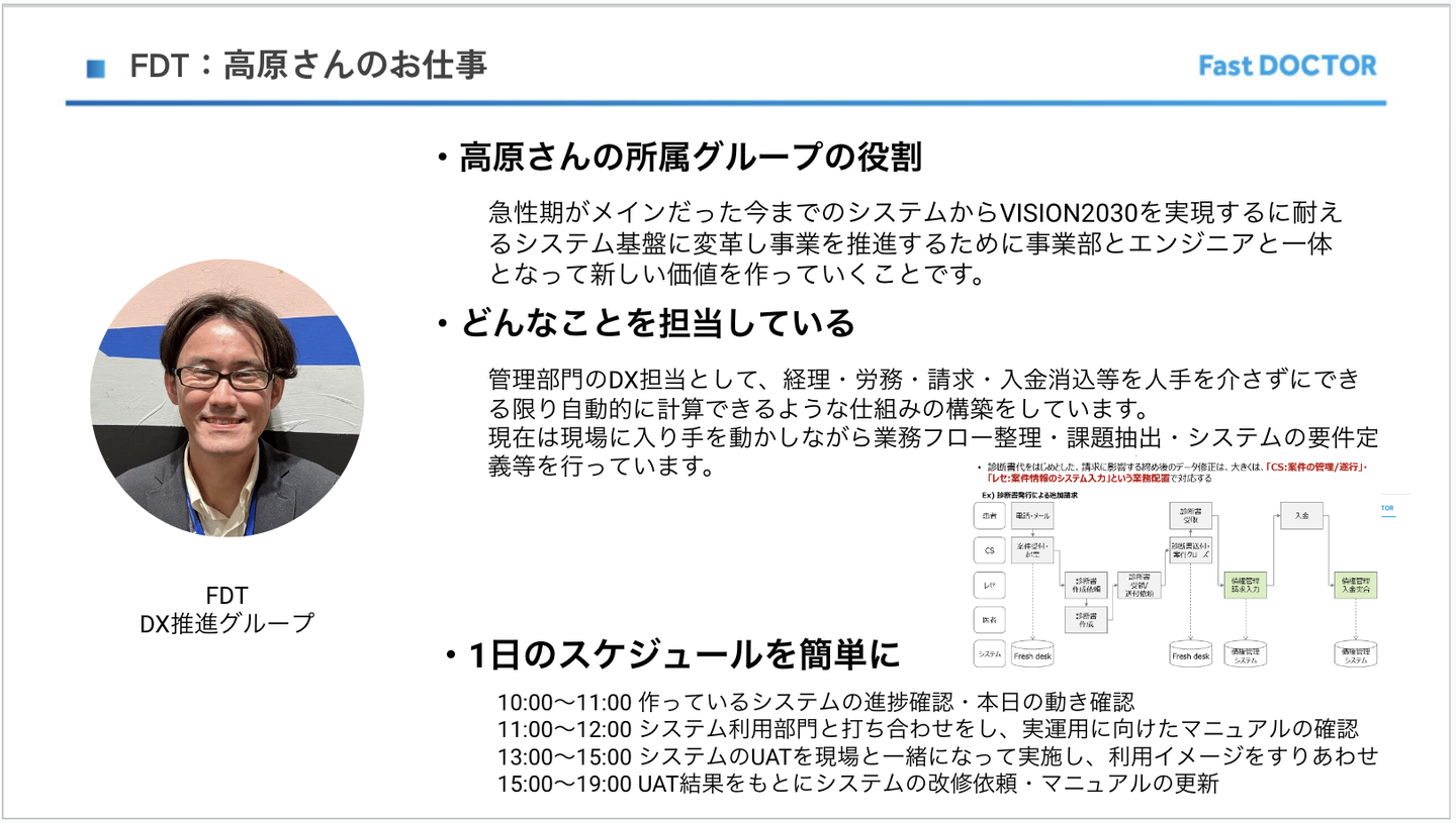 ファストドクターテクノロジーズ(FDT)所属の高原です。我々の部署はファストドクターが掲げるビジョン2030「1億人のかかりつけ機能を担う」を推進していくために、これまで救急往診の対応がメインの事業だったところから、新規事業の拡大を含めてテクノロジーを用いてどのような形で推し進めていくかを考え、システムの開発・導入・実装をしている部署です。そのなかで私はDX推進グループの管理部門のDX担当をしています。私の役割としてはこれまで経理や人事、請求などさまざまなものを人力で乗り切っていたところを、効率化・自動化していけるように整理しながら動いています。