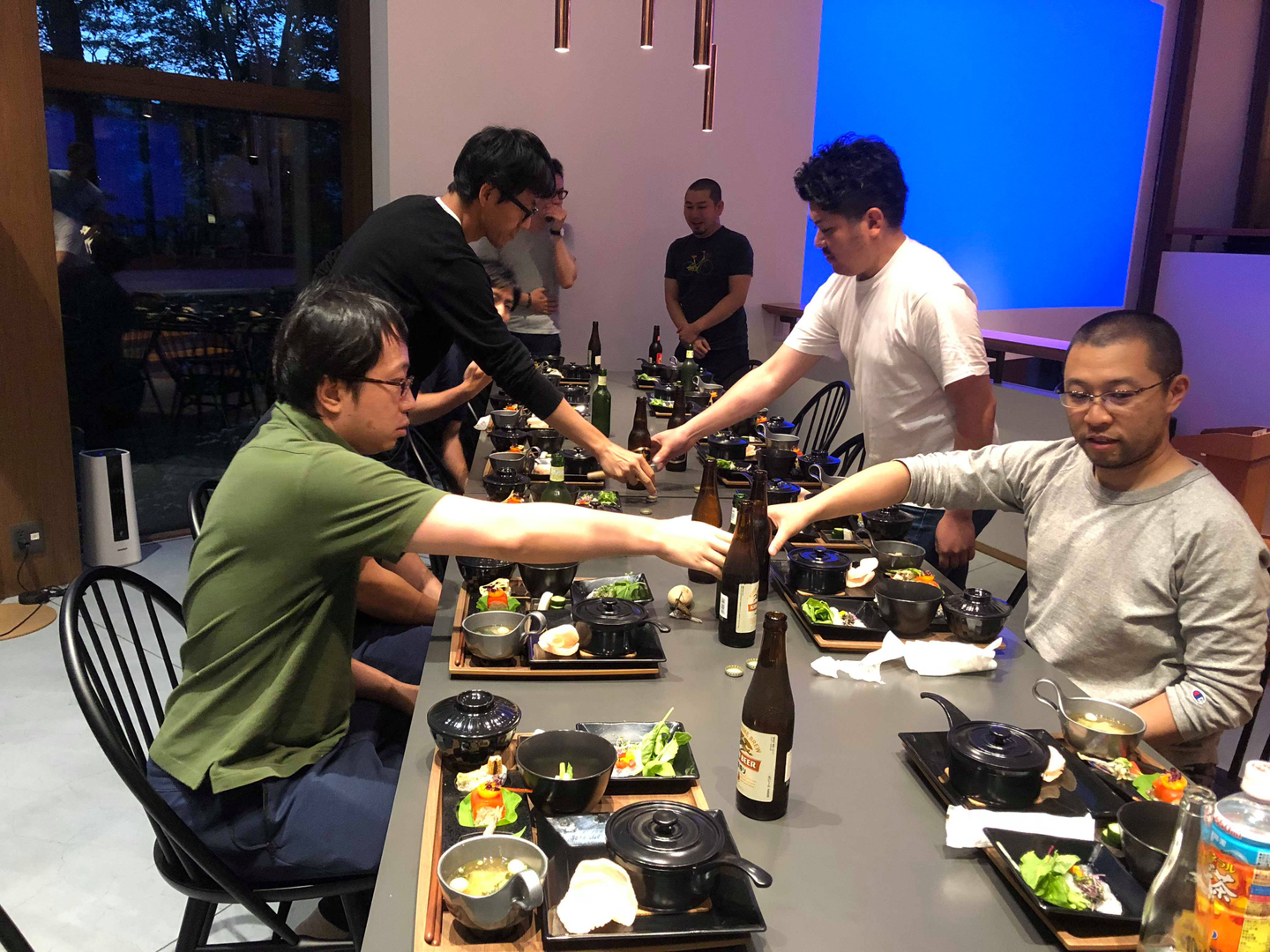 まだ議論が終わらない中、一旦つかの間の夕食です。 お酒も少々入れつつブレイクタイム