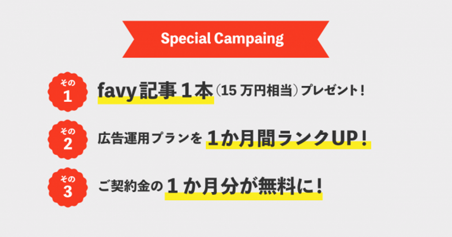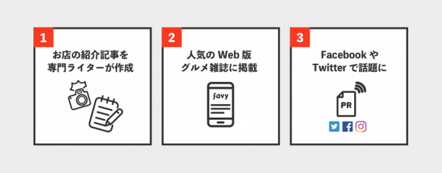 「favyプレミアムプラン」とは、favyが提供する飲食店特化型の集客サービスです。favy専属ライターが実際にお店を取材した記事を、web版グルメメディア「favy」にて公開し、SNS上でお店の情報を拡散することで新規顧客の集客をサポートします。