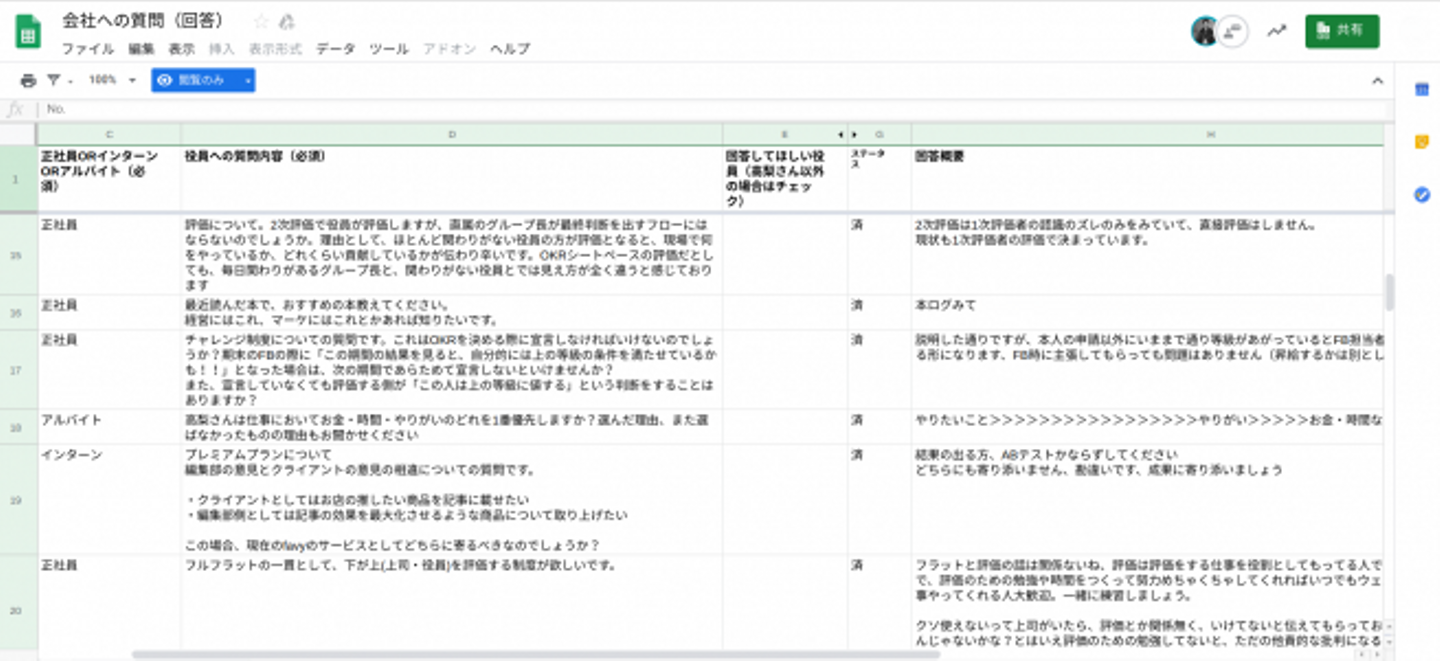 メンバーからの質問は以下の用に事前に書き込まれ、スプリント時に執行役員が直接回答します。