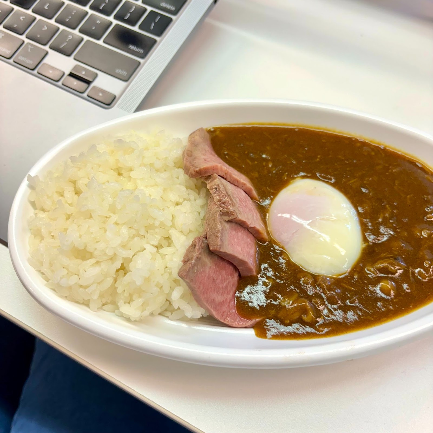 この日のメニューは、お肉たっぷり牛すじカレー。牛すじで出汁をとった肉の旨味がしっかり感じられるカレールーに、低温調理した低温調理した和牛がたっぷり!
