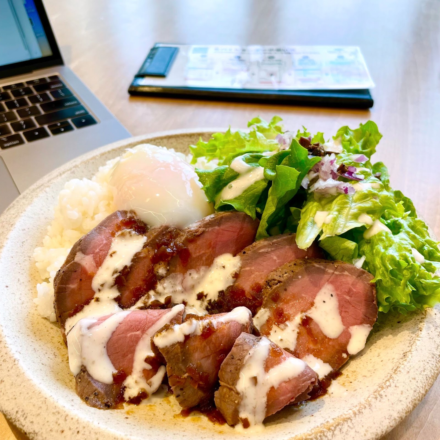coffee mafiaの初期からあるランチメニューで、食べごたえ抜群!しっとりやわらかいローストビーフと温泉卵でタンパク質補給。サラダも添えられているのが嬉しいポイント。