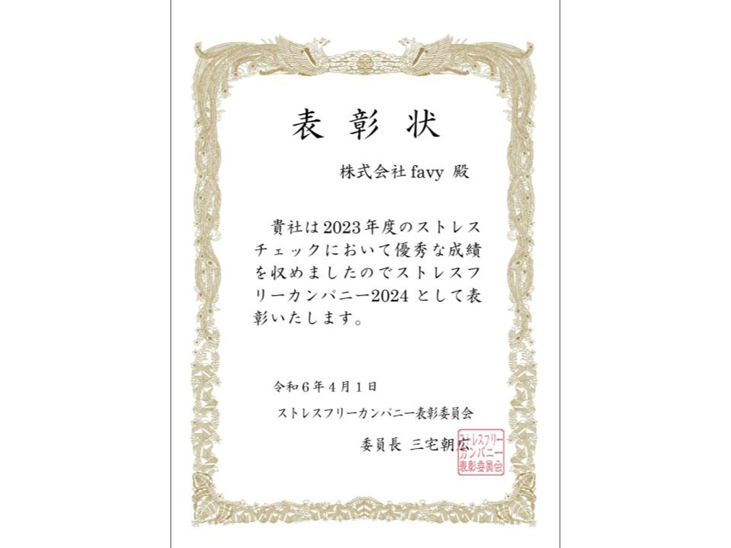厚生労働省が定めた「職業性ストレス簡易調査票」を利用したツール「ストレスチェッカー」の診断結果を元に、「ストレスフリーカンパニー表彰委員会」が「ストレスフリー」な会社を認定し表彰されます。
