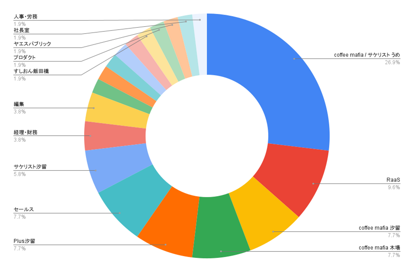 上記の表は、10期目に入社したメンバーの部署ごとの比率です。右上、青い部分は「coffee mafia & サケリスト うめきた」の店舗スタッフです。