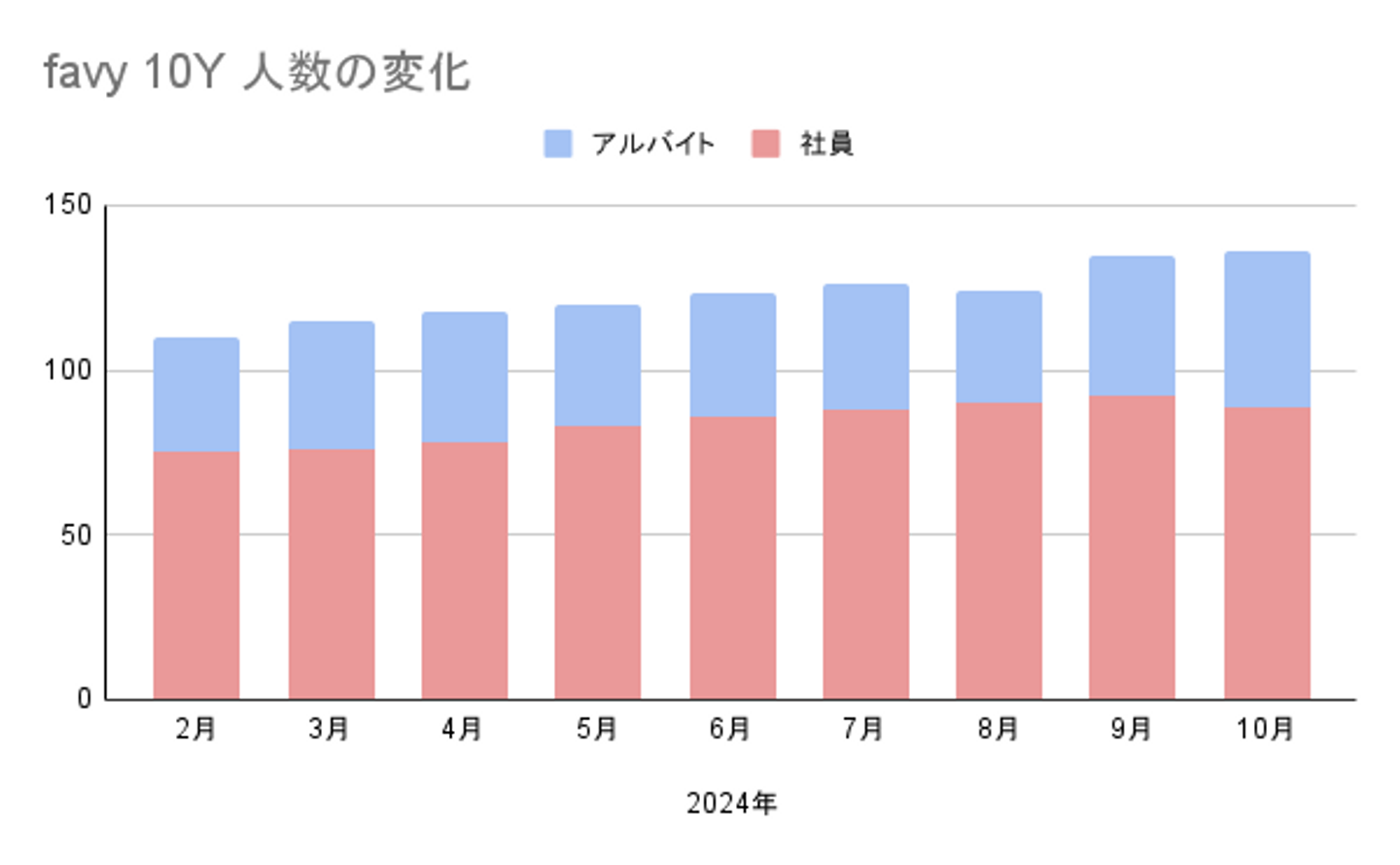 2024年2月は、株式会社favyと株式会社29ONが合併し、新たなfavyを110人のメンバーでスタートさせました。それから、8ヶ月たち、2024年10月1日には、社員・アルバイト合計136人にまで増えました。